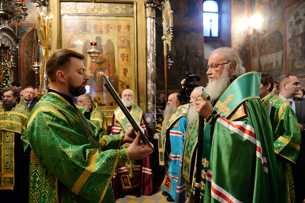 Его Святейшеству сослужили: митрополит Крутицкий и Коломенский Ювеналий, Патриарший наместник Московской епархии; митрополит Ташкентский и Узбекистанский Викентий, глава Среднеазиатского митрополичьего округа; митрополит Санкт-Петербургский и Ладожский Варсонофий, управляющий делами Московской Патриархии; митрополит Волоколамский Иларион, председатель Отдела внешних церковных связей Московского Патриархата; архиепископ Верейский Евгений, ректор Московской духовной академии, председатель Учебного комитета Русской Православной Церкви; архиепископ Сергиево-Посадский Феогност, наместник Троице-Сергиевой лавры, председатель Синодального отдела по монастырям и монашеству; епископ Солнечногорский Сергий, руководитель Административного секретариата Московской Патриархии; духовенство.