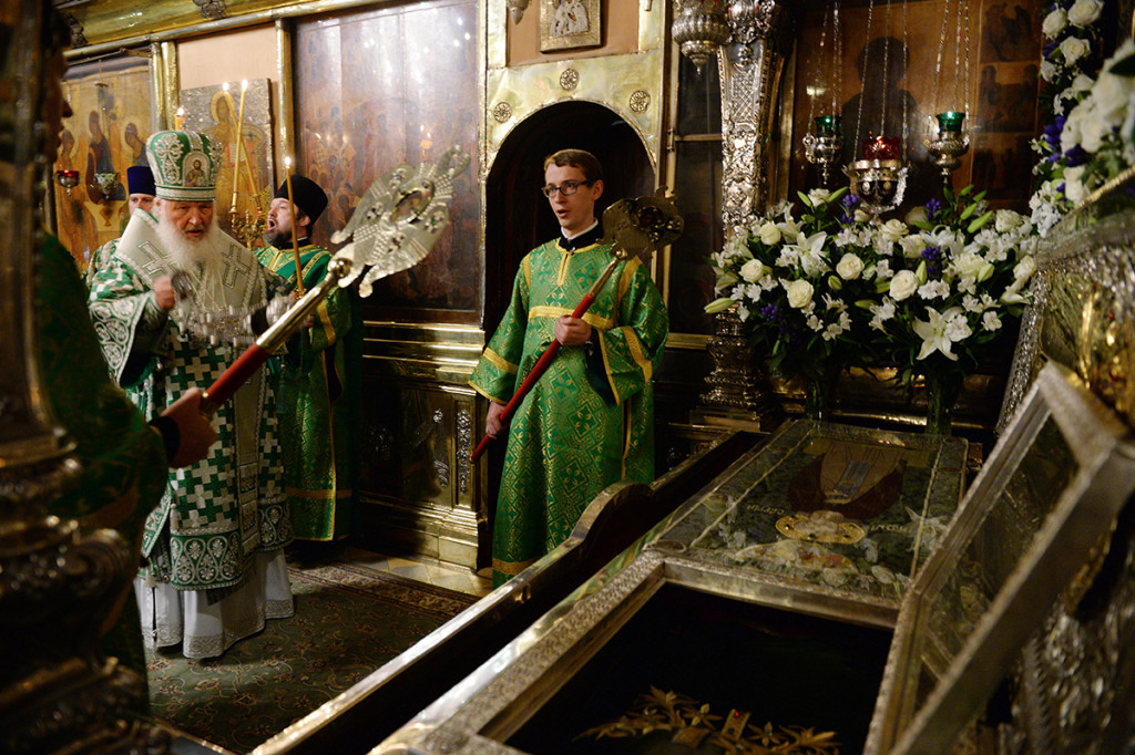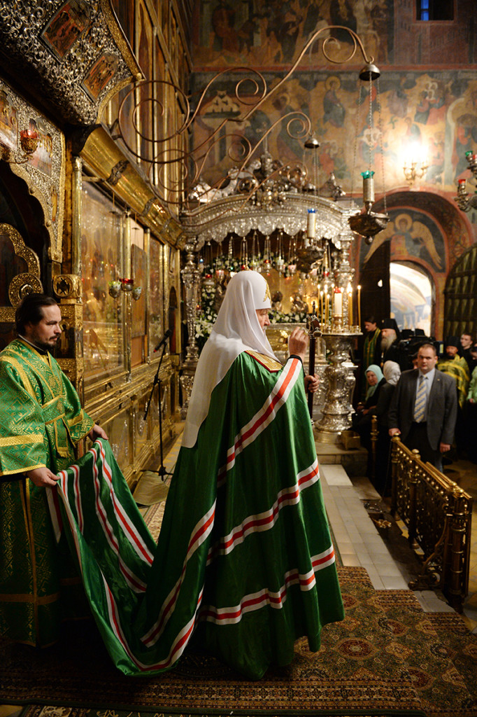 7 октября 2016 года, в канун дня преставления преподобного Сергия, игумена Радонежского, всея России чудотворца (1392), Святейший Патриарх Московский и всея Руси КИРИЛЛ совершил всенощное бдение в Троицком соборе Свято-Троицкой Сергиевой лавры.