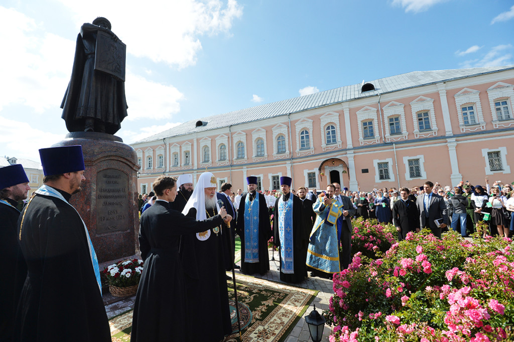 Предстоятель Русской Православной Церкви прочитал молитву на освящение и окропил памятник святой водой.