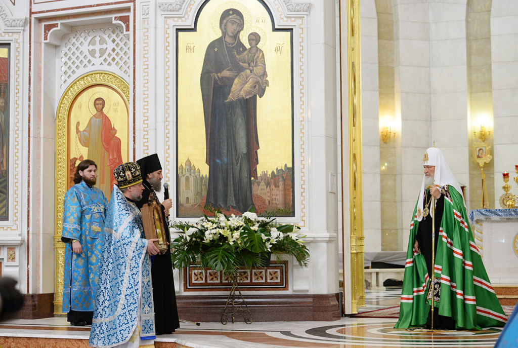 По окончании Литургии архиепископ Балтийский Серафим приветствовал Святейшего Владыку и преподнес Его Святейшеству список Иверской иконы Божией Матери.