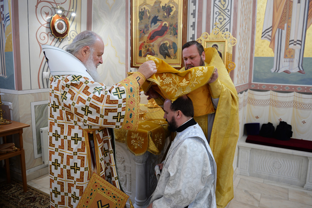 За Литургией Святейший Патриарх КИРИЛЛ рукоположил диакона Сергия Брегеду, клирика храма Введения во храм Пресвятой Богородицы в Вешняках (Восточное викариатство Московской городской епархии), в сан иерея.