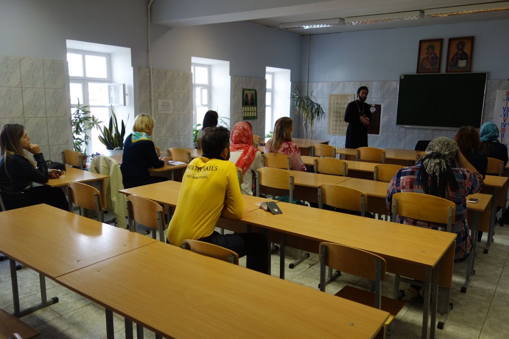 В воскресной школе (воскресной группе) для взрослых занятие провел иерей Роман Чистяков, преподающий в монастырской церковно-певческой школе и ответственный за молодежное служение в обители.