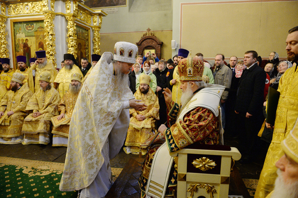 По окончании Литургии Святейший Патриарх КИРИЛЛ напутствовал епископа Волжского и Сернурского Феофана на служение и вручил ему архиерейский жезл. По традиции новорукоположенный епископ преподал верующим первое архипастырское благословение.