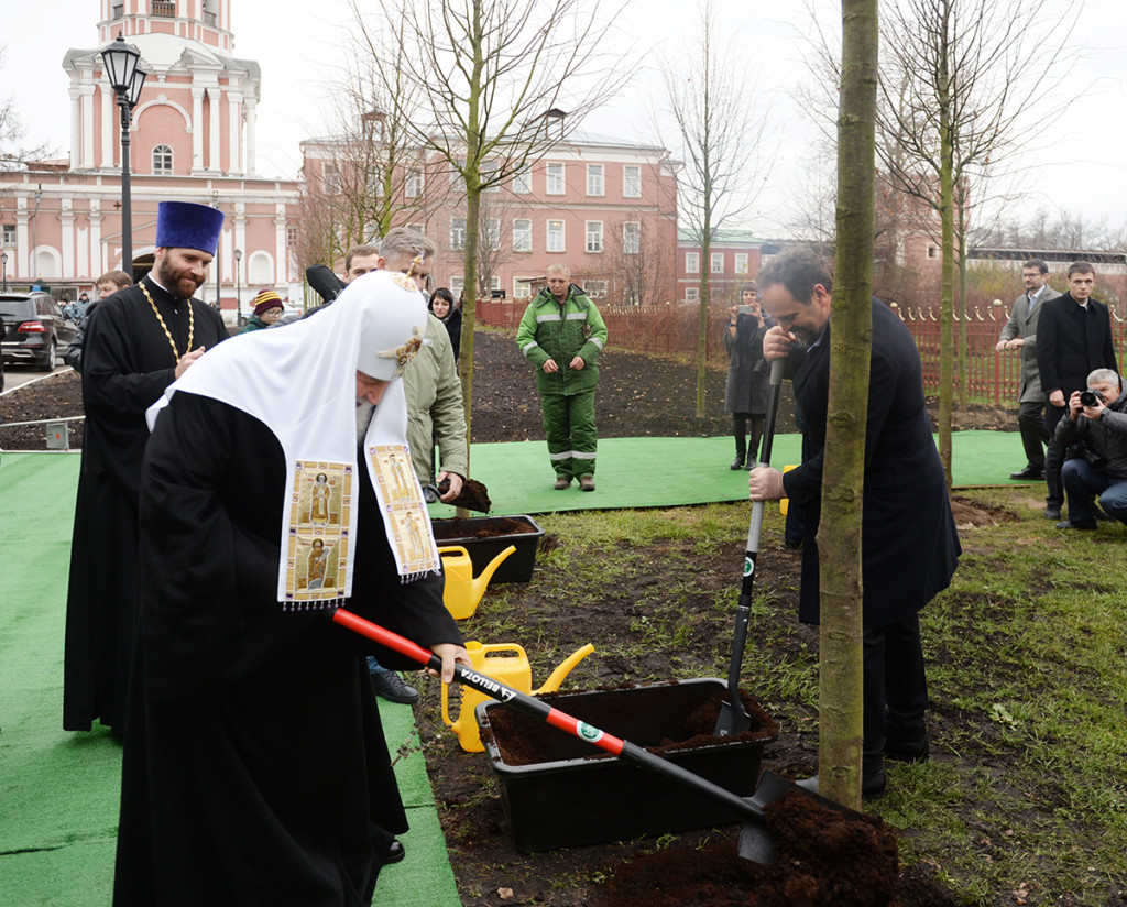 ...По окончании Божественной литургии в Донском ставропигиальном монастыре Москвы, Святейший Патриарх Московский и всея Руси КИРИЛЛ и министр природных ресурсов и экологии Российской Федерации С.Е. Донской приняли участие в церемонии посадки деревьев главной липовой аллеи у Большого собора Донской обители. В мероприятии также участвовали представители Правительства города Москвы.