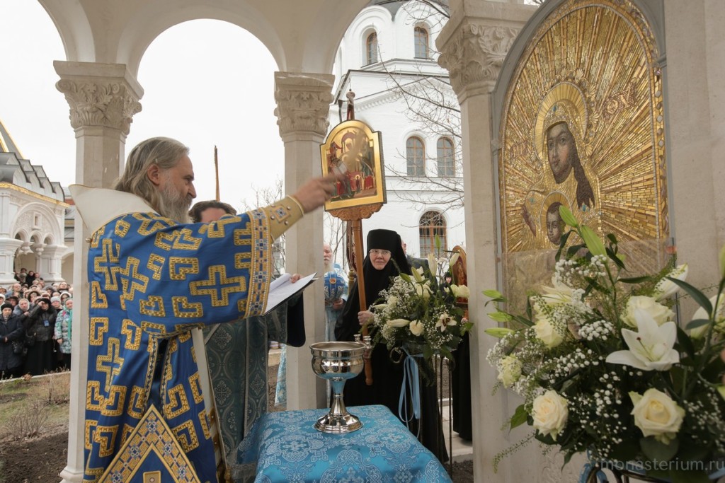 По заамвонной молитве торжественный крестный ход направился к вновь установленной каменной палатке-сени с мозаичной копией чудотворной монастырской иконы Божией Матери «Милостивая». Высокопреосвященнейший Владыка возглавил чин освящения иконы Богородицы.