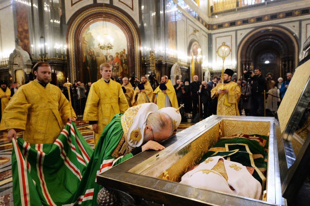 Святейший Патриарх Московский и всея Руси КИРИЛЛ вышел к западным вратам Храма Христа Спасителя, куда прибыл автомобиль с честными мощами святителя Тихона. Первый викарий Святейшего Патриарха по городу Москве митрополит Истринский Арсений, руководитель Административного секретариата Московской Патриархии архиепископ Солнечногорский Сергий, епископ Подольский Тихон и епископ Бронницкий Парамон внесли гроб с честными мощами в Храм Христа Спасителя и вложили его в раку.