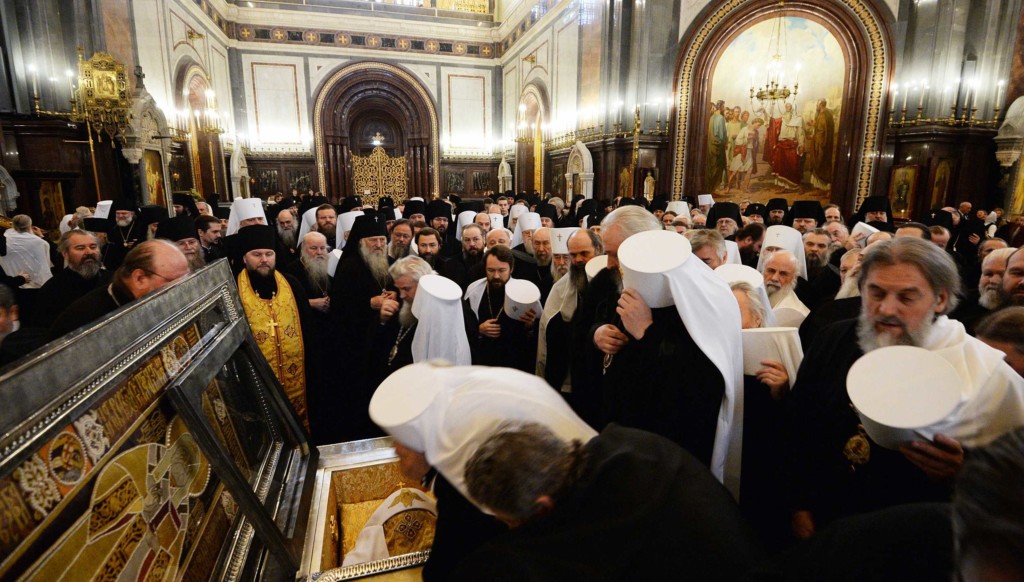 К началу Собора в Храм Христа Спасителя из Донского ставропигиального мужского монастыря были принесены честные мощи святителя Тихона, Патриарха Московского.