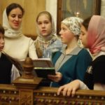 - Учащиеся воскресной школы монастыря вместе с преподавателем поют за Божественной литургией. 7 января 2018 г.