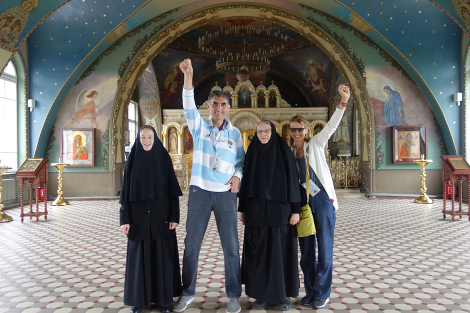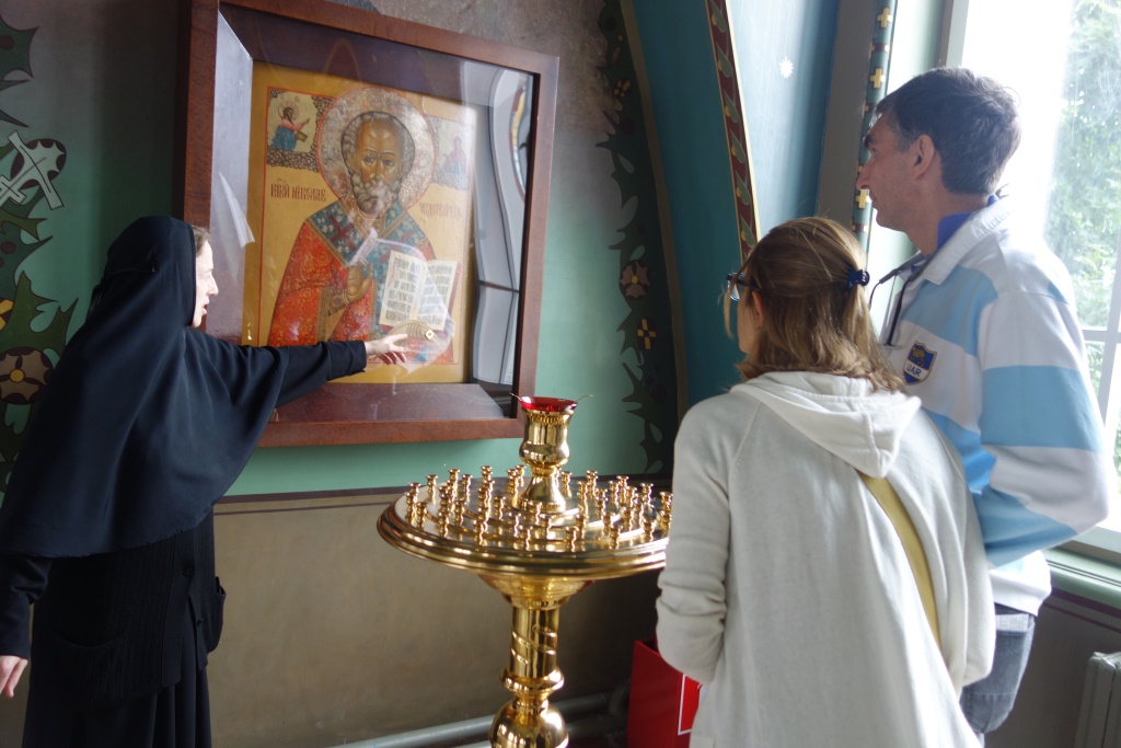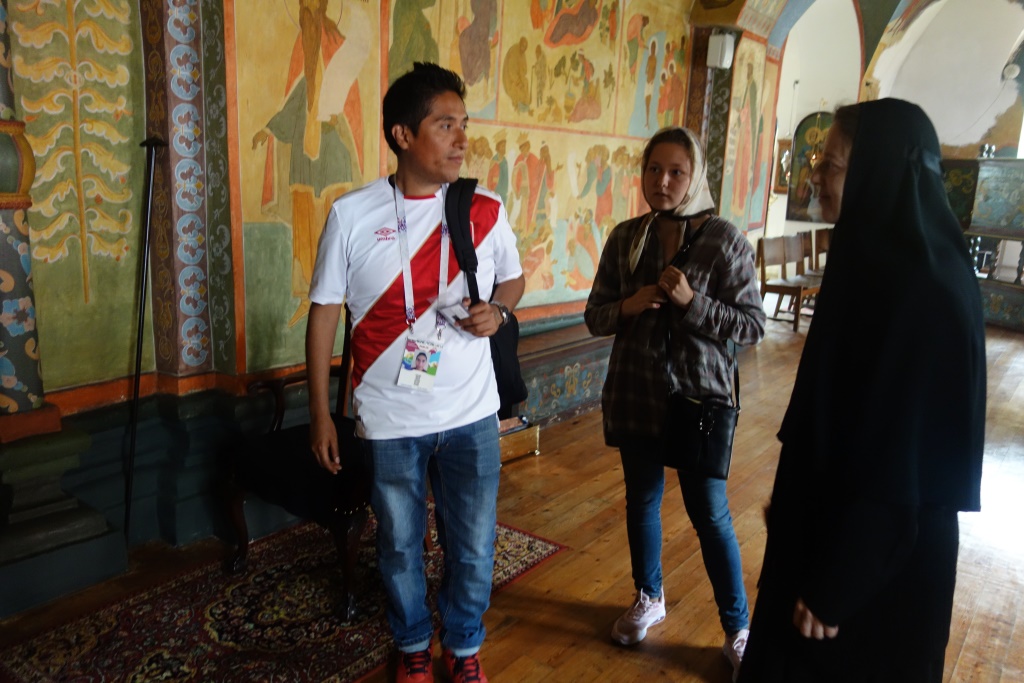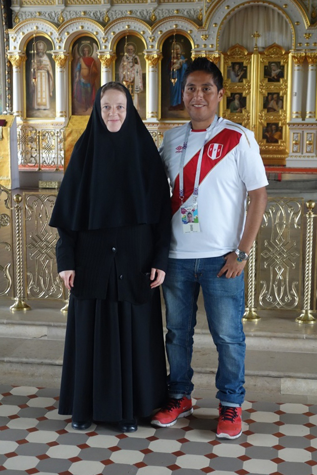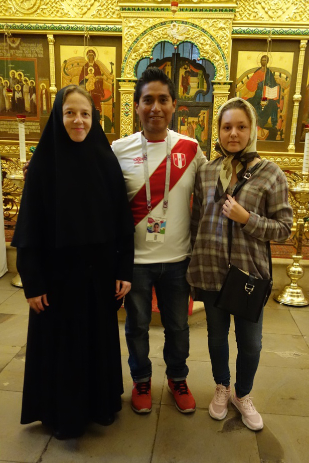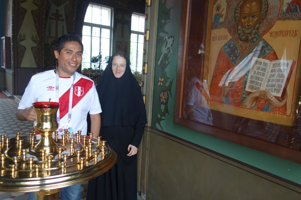 Еще один гость нашей обители, Уильям Ричард Тарасона, прибыл на Чемпионат мира FIFA 2018 из Перу. Болельщик поддерживает свою команду, а также команду России, за которую будет болеть 6 июля. Наш гость пожелал немного побыть в тишине, помолиться, и ради этого пришел в обитель. Вместе с ним пришла и его переводчица Дарья. Благочинная монастыря показала гостям обитель – храмы, святыни, монастырскую территорию. Нам радостно, что приходящие в обитель знают многих чтимых нами святых, и особенно – святителя Николая Чудотворца, который, как известно, является скорым помощником и хранителем от бед для всех, призывающих его, в том числе – путешествующих.