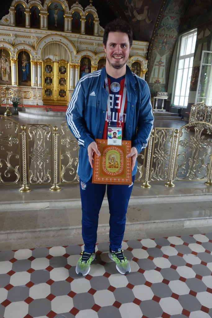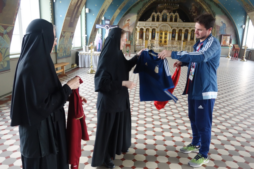 15 июля 2018 г. монастырь снова посетил футбольный болельщик Родриго из Аргентины. За период проведения в России Чемпионата мира по футболу, он неоднократно приходил в обитель помолиться и был всегда радушно встречаем сестрами. Родриго - юрист, футболист, имеет на своей родине футбольную команду, но в Россию прибыл как болельщик. Он интересуется Православием, и ему нравится сама атмосфера монастыря. Он с радостью приходит в монастырские храмы помолится о своих близких. За это время Родриго стал искренним другом нашей обители. И сегодня он пожелал чем-нибудь отблагодарить монастырь за гостеприимство. Кроме посильной лепты на возрождение, Родриго подарил обители как своего рода "сувенир" футболки болельщиков.