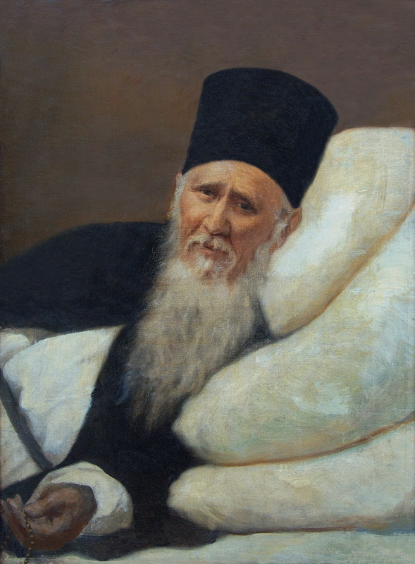 На этом портрете старец как будто ожидает кого-то на исповедь, безмолвно произнося слова молитвы и перебирая монашеские четки. Темный фон, отсутствие лишних деталей только сильнее оттеняет его проникновенный глубокий взгляд, исполненный пастырской любви и снисхождения. Белые подушечки и светлый хитон подчеркивают бледность лица немощного старца, взгляд которого обращен в самое сердце и располагает к покаянию и молитве.
