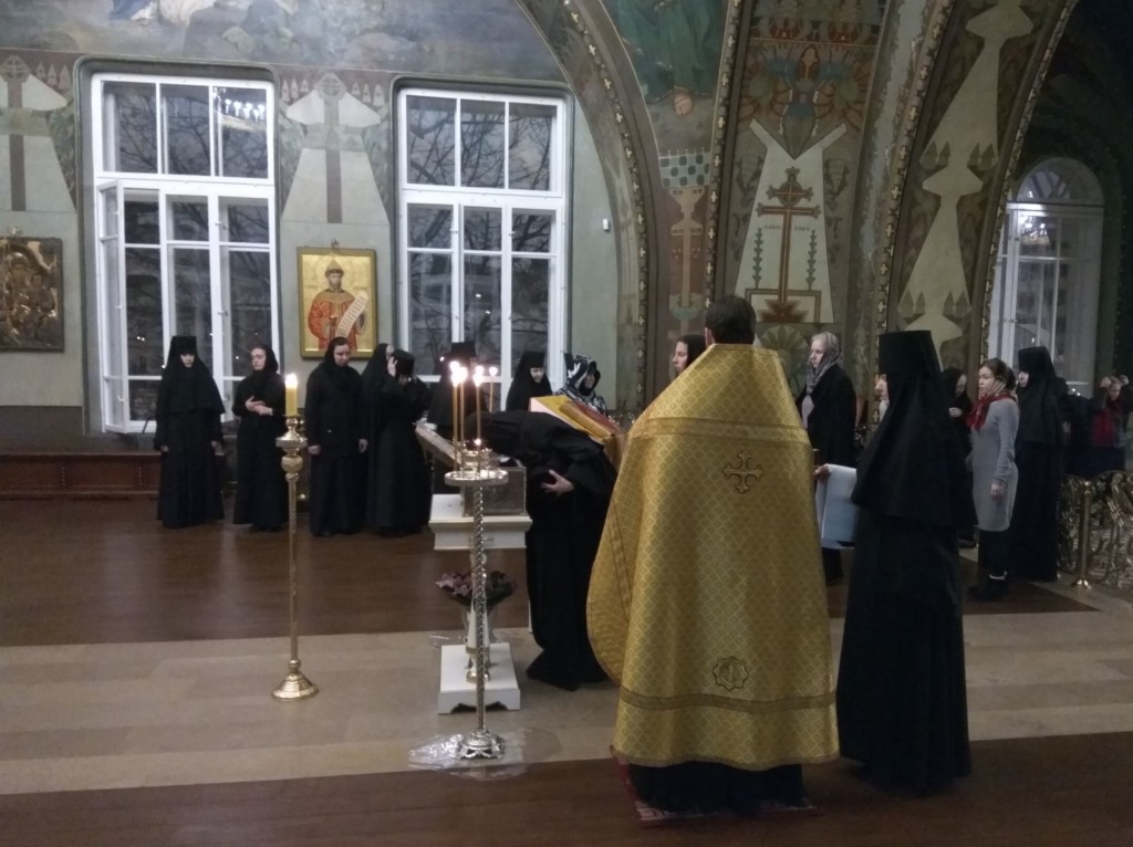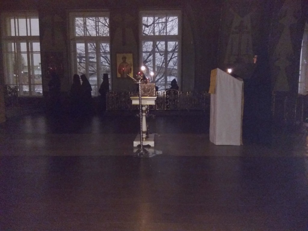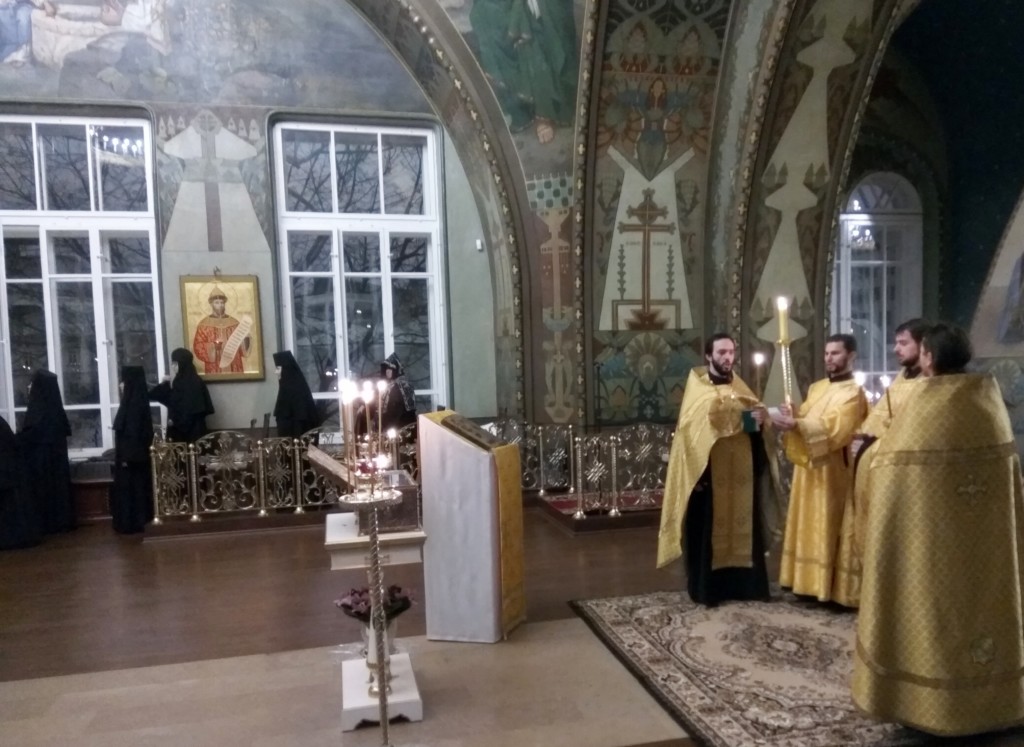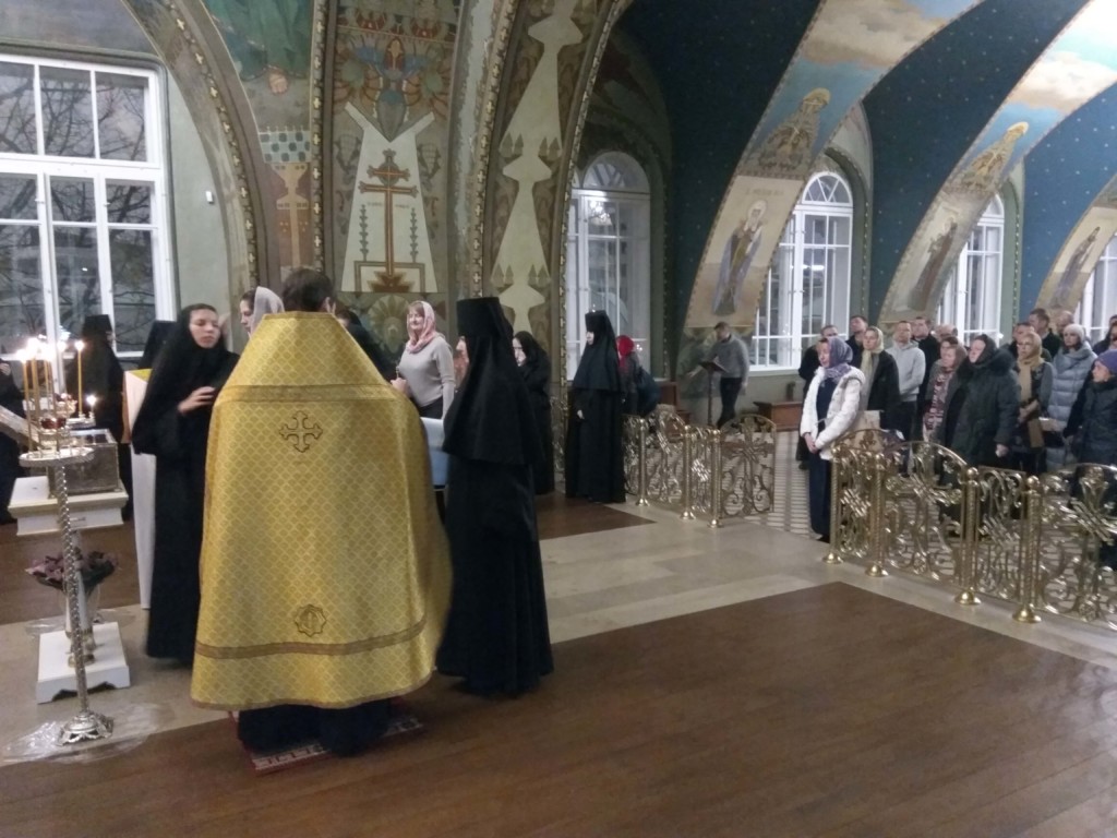 8 декабря 2018 г., вечером, накануне Недели 28-й по Пятидесятнице и воспоминания освящения храма вмч. Георгия Победоносца в Киеве, в нашей обители состоялось всенощное бдение, которое совершило монастырское духовенство. В монастыре хранится частица св. мощей великомученика Георгия, поэтому в обители чтят все события, связанные с жизнью, страданием и прославлением святого. И сегодня воскресная служба соединялась со службой великомученику Георгию. В храме молились сестры и прихожане обители.