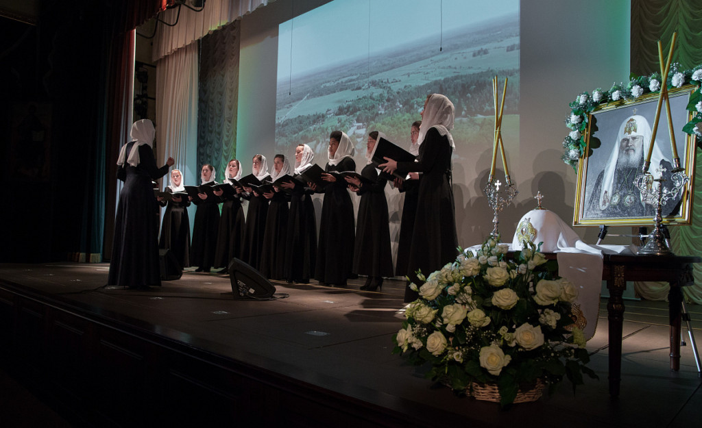 Воспитанницы Регентской школы при МДА под управлением Ксении Тарелкиной исполнили песню на слова Патриарха Пимена «Есть в далекой земле небольшой монастырь…». Эта песня напоминала Святейшему о его родине – Эстонии и Свято-Успенском Пюхтицком ставропигиальном женском монастыре.