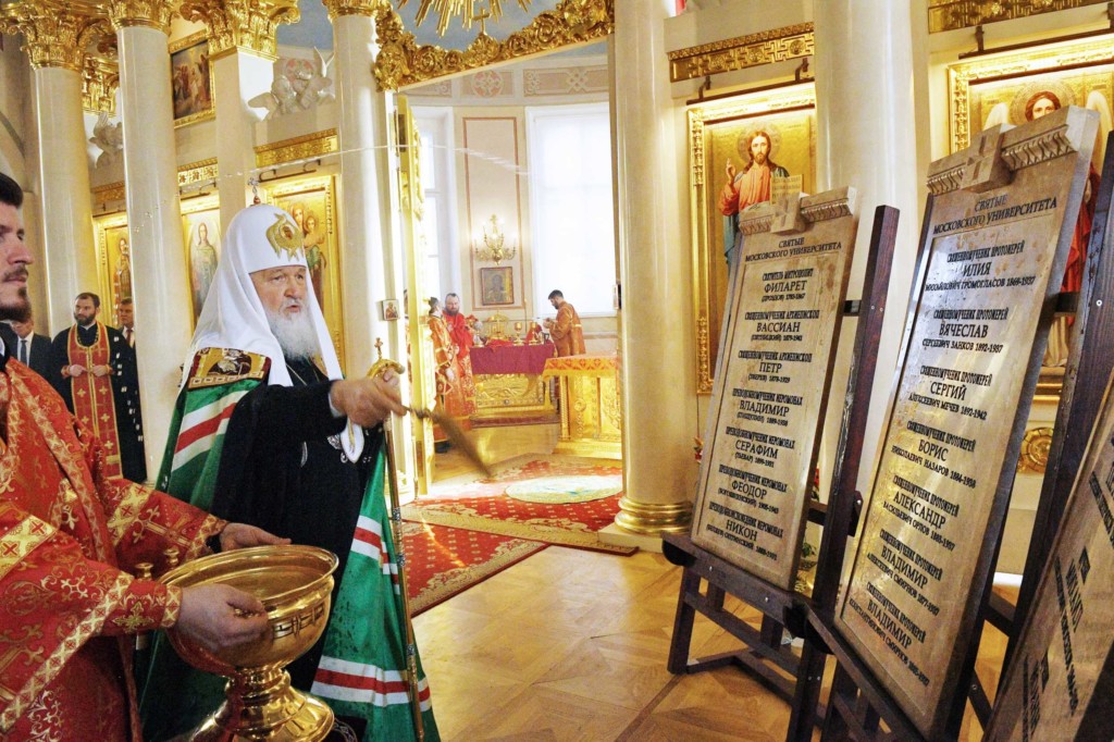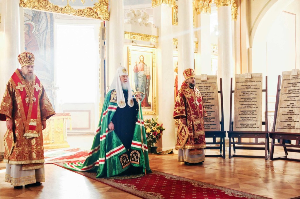 По завершении Литургии на амвоне храма Святейший Патриарх Кирилл освятил три каменные доски с именами святых, обучавшихся и преподававших в Московском государственном университете.
