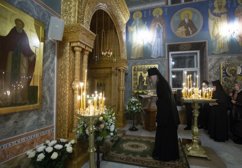Накануне была отслужена малая вечерня с акафистом преподобным Кириллу и Марии. Всенощное бдение совершил архимандрит Макарий (Веретенников), насельник Троице-Сергиевой лавры, профессор Московской духовной академии, член Синодальной литургической комиссии.