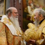 Блаженнейший митрополит Киевский и всея Украины Онуфрий зачитал поздравительный адрес членов Священного Синода Русской Православной Церкви Святейшему Патриарху Кириллу и преподнес Предстоятелю Русской Православной Церкви от Священного Синода памятные дары — предносной крест и комплект из двух панагий и наперсного креста.