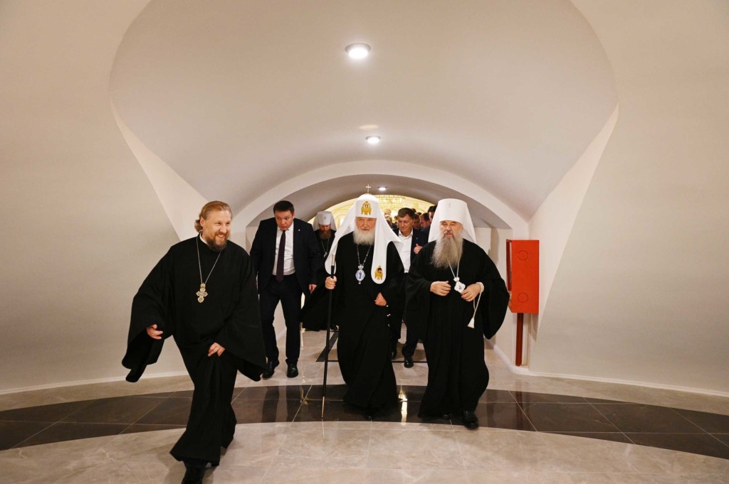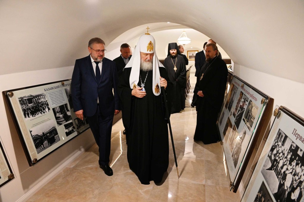 Затем Святейший Патриарх Кирилл осмотрел нижние помещения Казанского собора, в которых недавно завершились ремонтно-восстановительные работы, — крестильный храм в честь священномученика Ермогена, актовый зал и др.