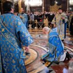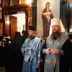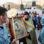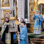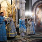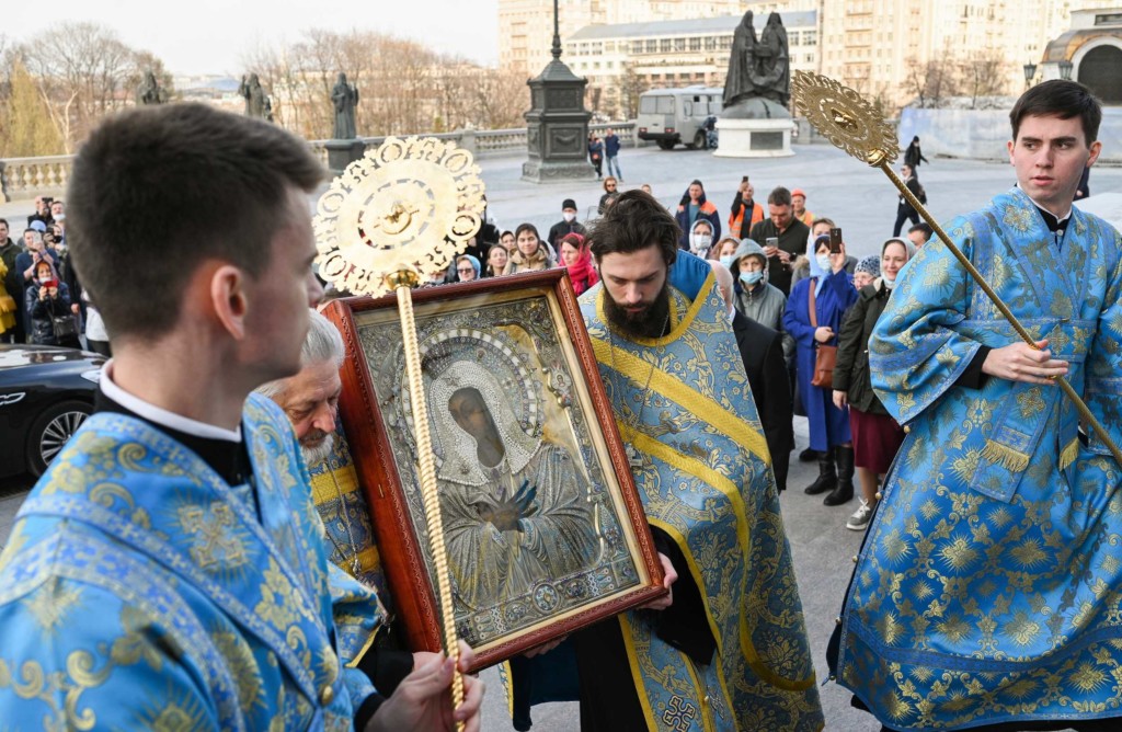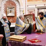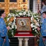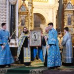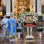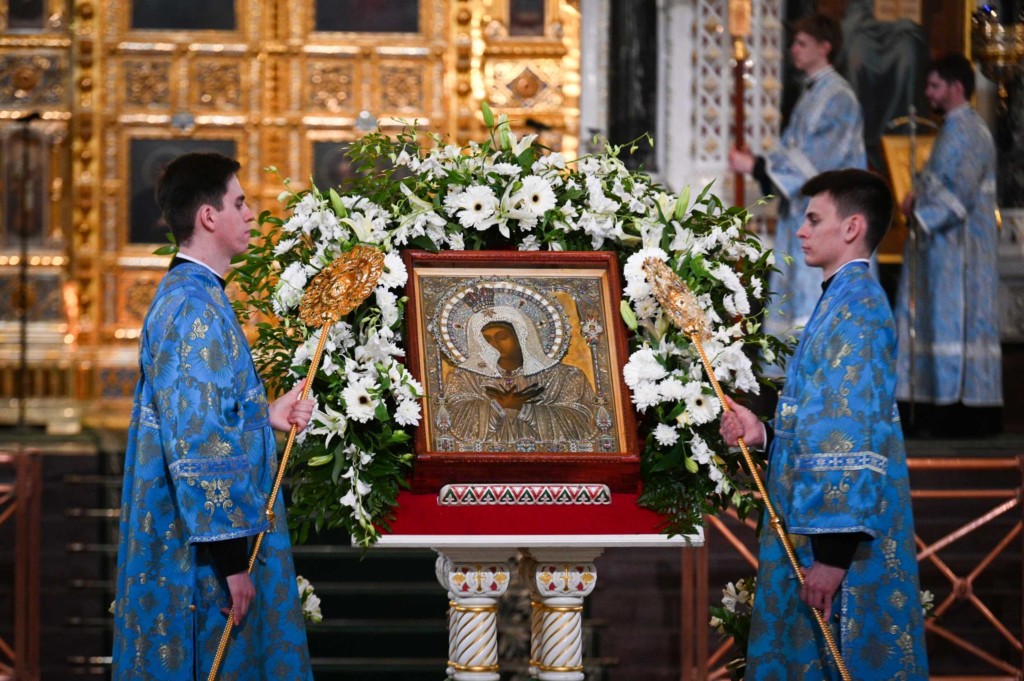 Перед началом чтения акафиста Пресвятой Богородице святыня была вынесена из алтаря и установлена на аналое в центре Храма Христа Спасителя.