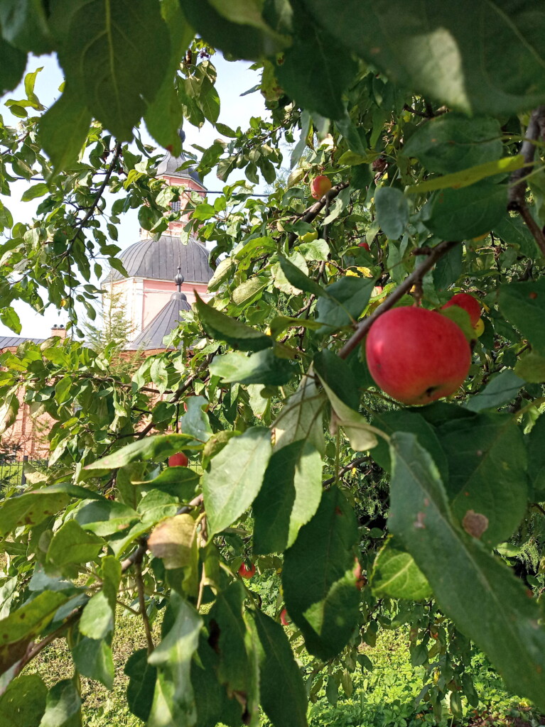 Перед светлым праздником Преображения Господня на подворье обители стоят жаркие солнечные дни. В монастырском саду поспевают яблоки поздних сортов и немного ранних, которые завтра будут освящаться во время праздничного богослужения.