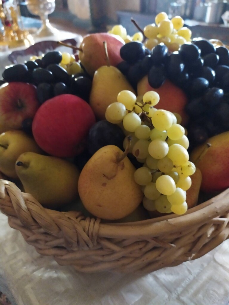 Благодарим Господа за то, что даровал плоды земли, необходимые для наших нужд, и что дарует помощь каждому в приобретении плодов духовных: любви, радости. мира, долготерпения, благости, милосердия. веры, кротости, воздержания...