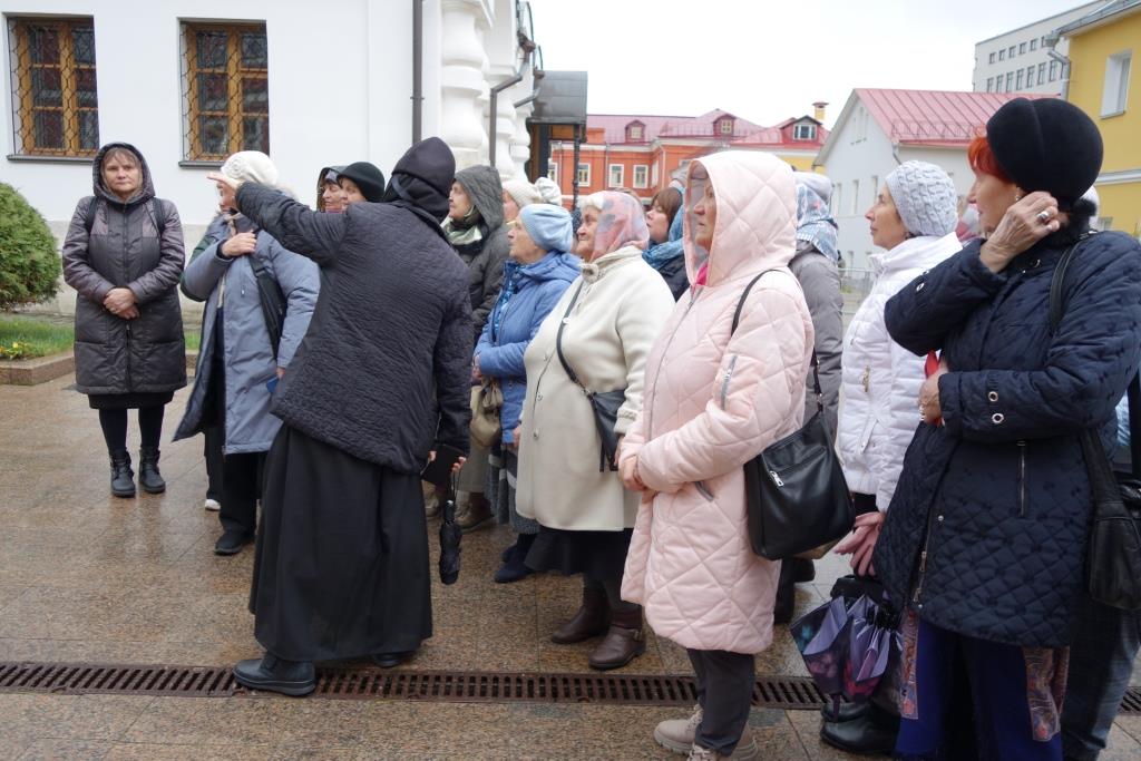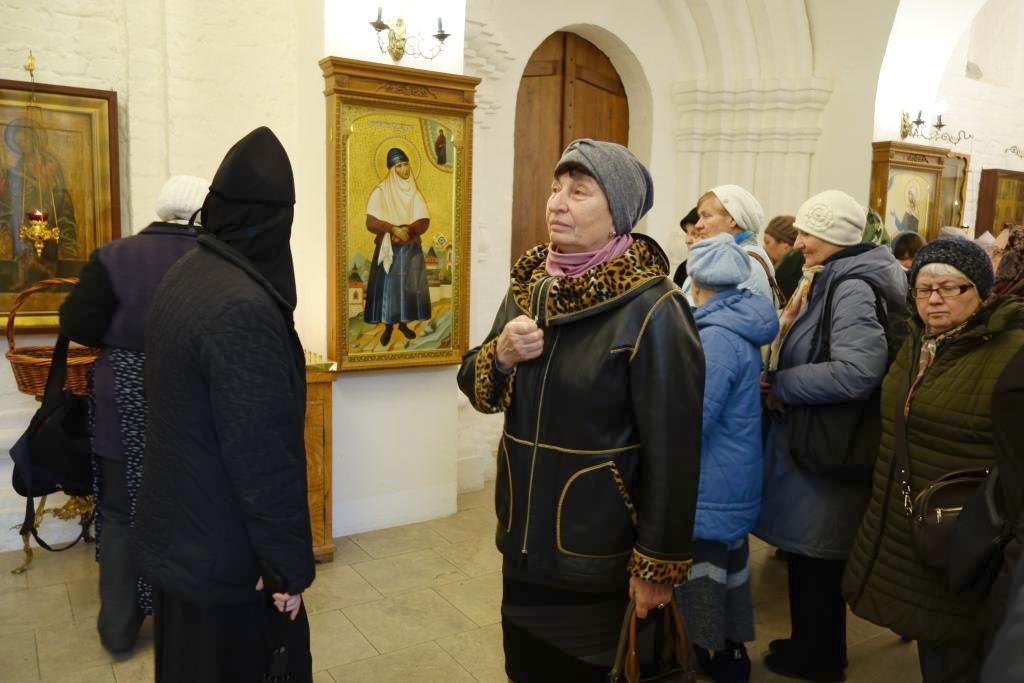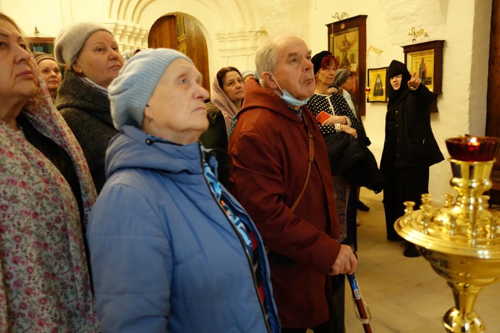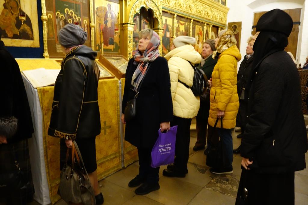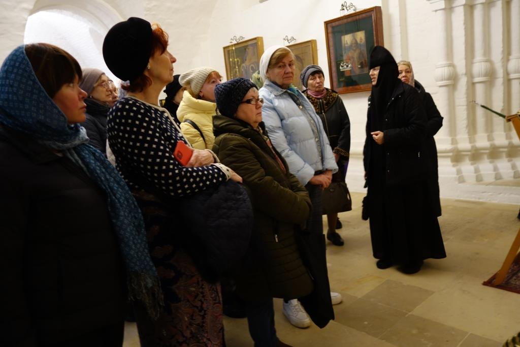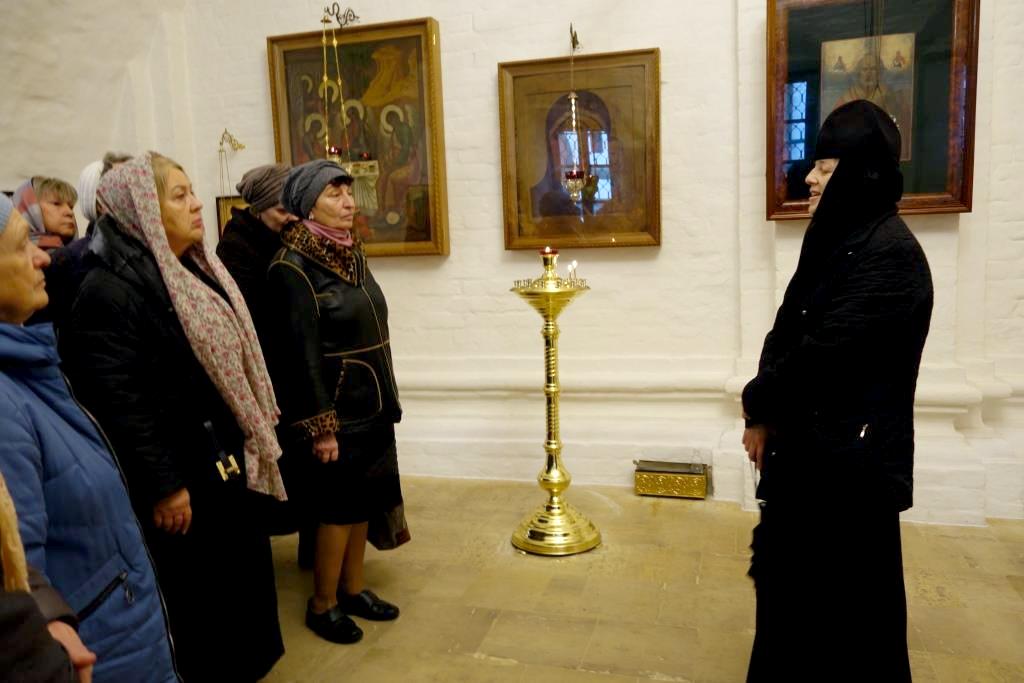 Паломников встретила благочинная монастыря, которая провела экскурсию по храмам и территории обители. Наши гости помолились у монастырских святынь, в том числе у чтимой иконы Апостола и Евангелиста Иоанна Богослова и мученика Лонгина Сотника, чья память празднуется 29 октября.
