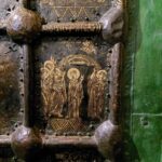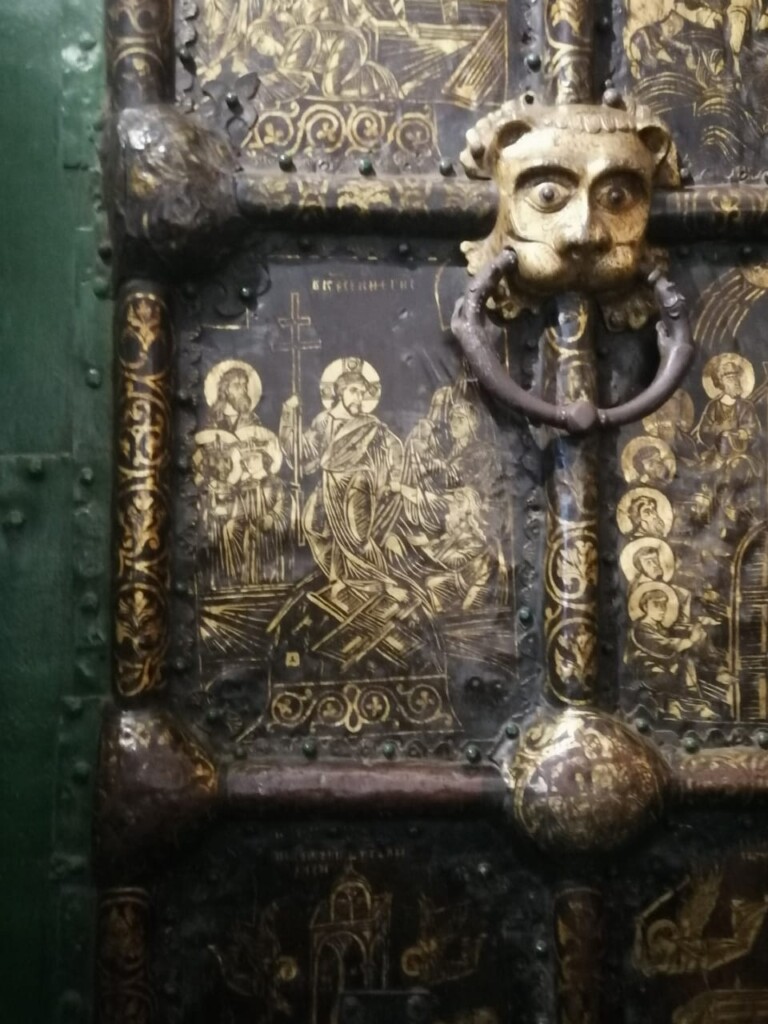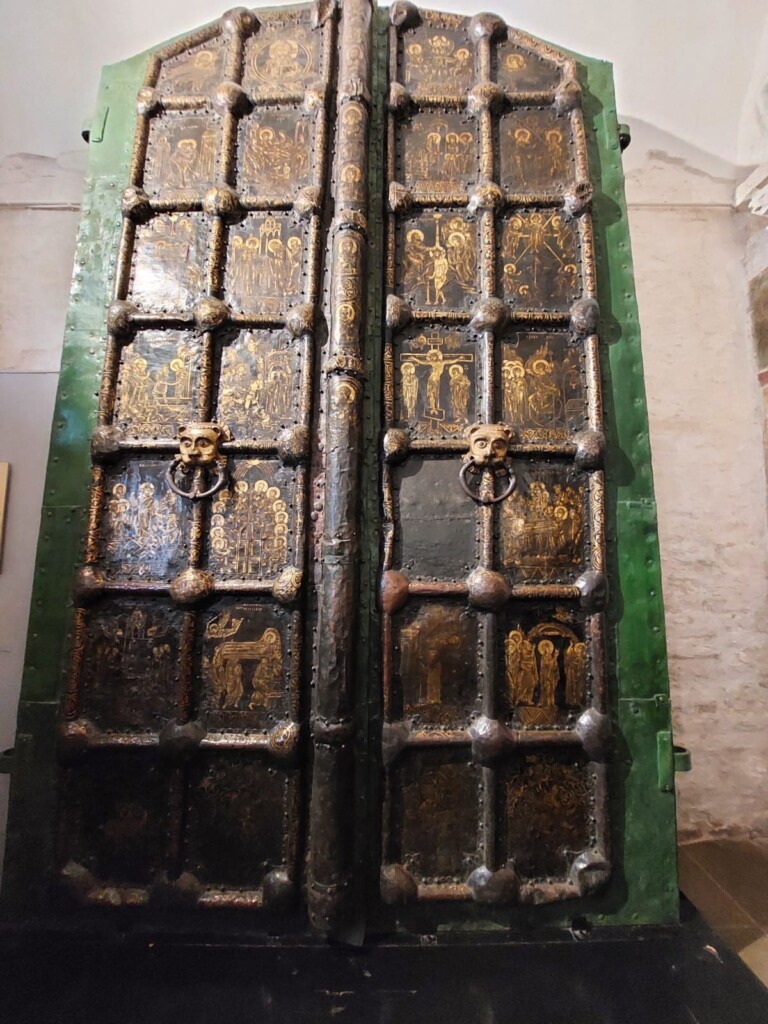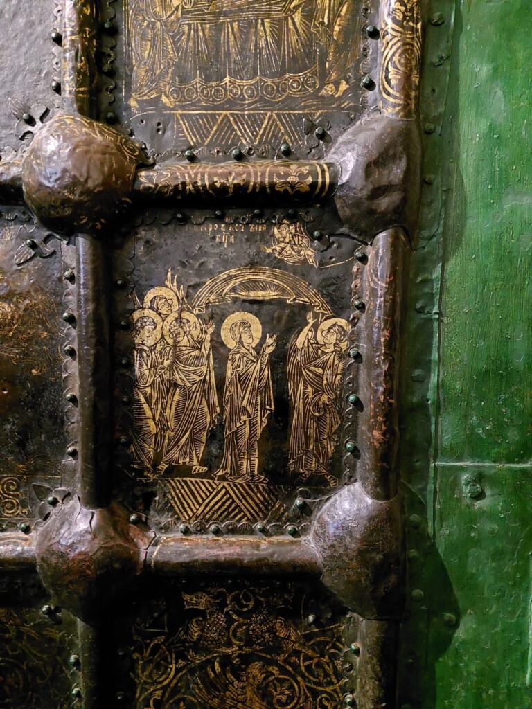 Благодаря опытным экскурсоводам мы смогли узнать и историю создания знаменитых «золотых» дверей собора. Западные и южные врата, созданные в первой половине XIII в., были изготовлены мастерами из деревянной основы, обитой листами из черненой меди, и украшены изображениями, выполненными в технике золотой наводки.
