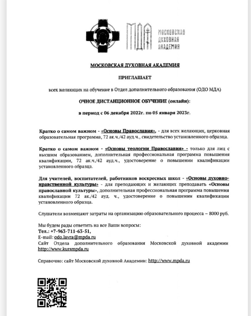 Отдел дополнительного образования Московской Духовной Академии с 6 декабря 2022 г. по 5 января 2023 г. проводит очное дистанционное обучение по следующим предметам: "Основы Православия", "Основы теологии Православия", "Основы духовно-нравственной культуры". Дополнительные сведения об условиях обучения можно узнать по телефону: +7 (963) 711-53-87