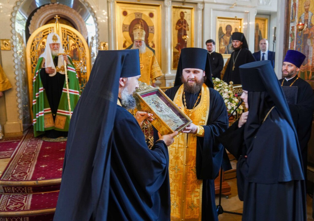 По окончании богослужения игумения Ксения (Чернега) приветствовала Святейшего Владыку и преподнесла Его Святейшеству икону преподобного Алексия, человека Божия.
