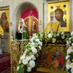 Икона была возложена на аналой, Святейший Владыка и архиереи поклонились святому образу.