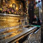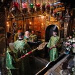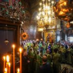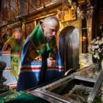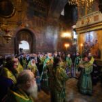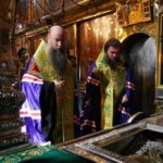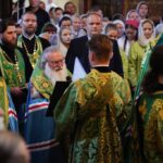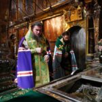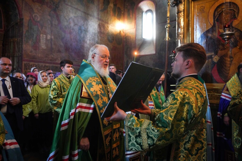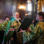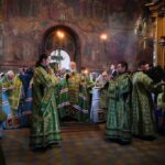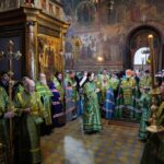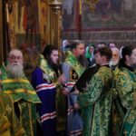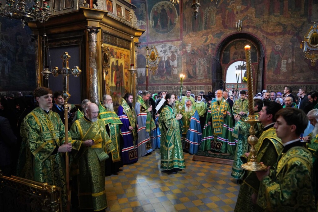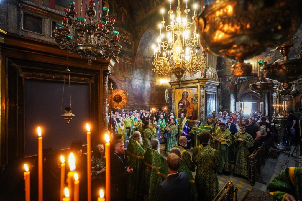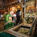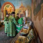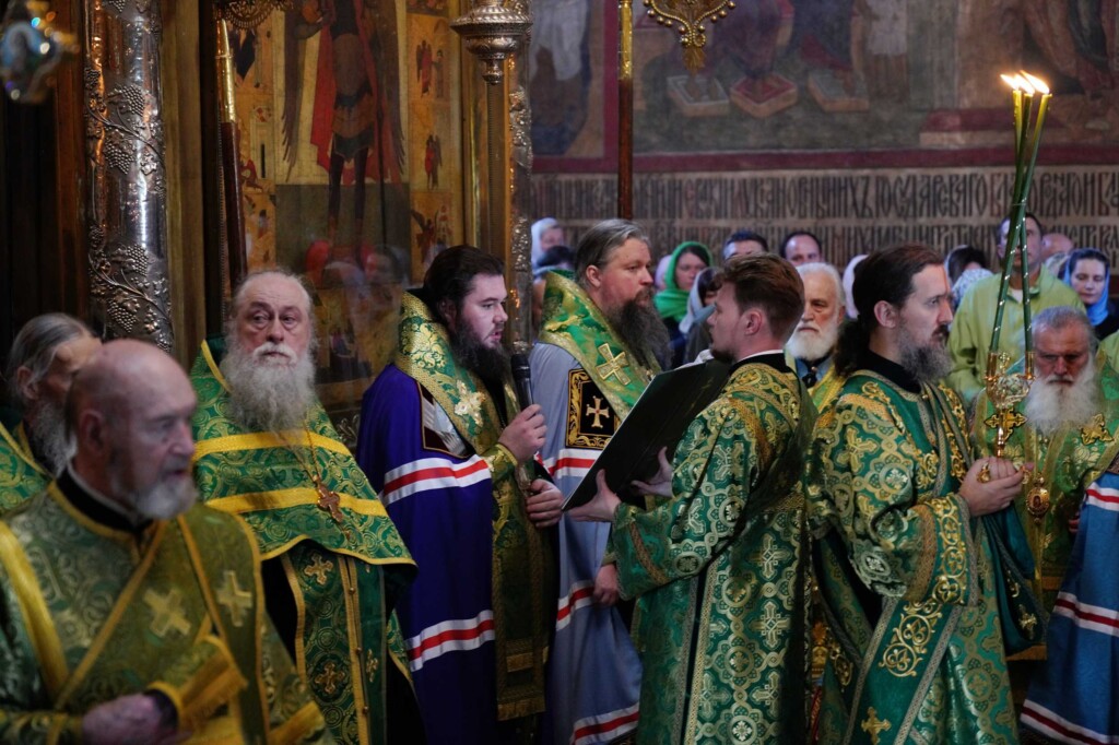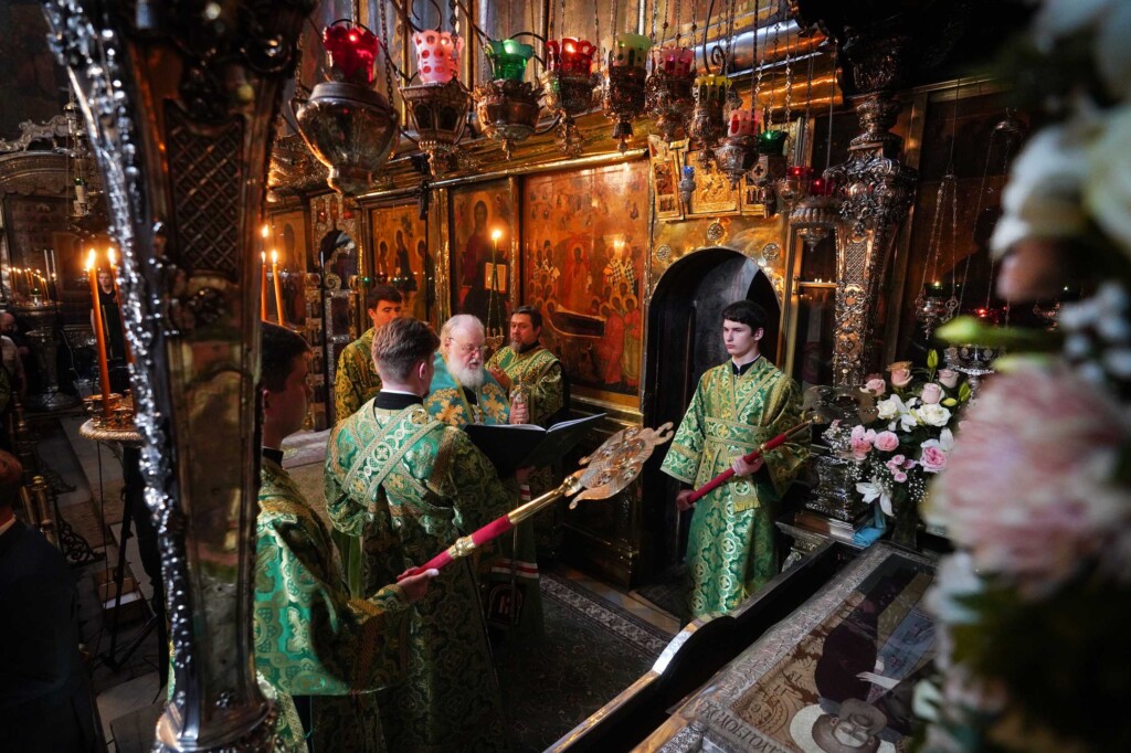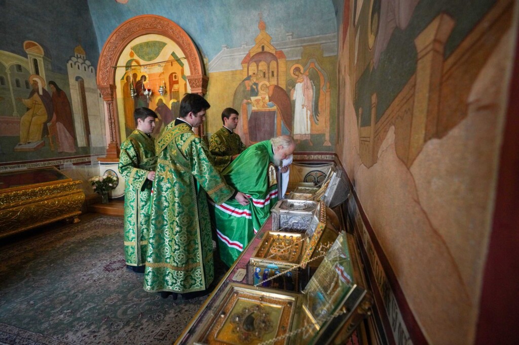 Святейший Патриарх Кирилл проследовал в Троицкий собор, где совершил славление и поклонился честным мощам преподобного Сергия Радонежского. Святейший Владыка также поклонился святыням Никоновского придела и Серапионовой палаты.