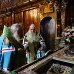 Затем в Троицком соборе, где покоятся честные мощи преподобного Сергия, Святейший Патриарх Кирилл возглавил служение малой вечерни с чтением акафиста Преподобному.