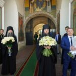 У святых врат обители Предстоятеля Русской Православной Церкви встречали: наместник Лавры епископ Сергиево-Посадский и Дмитровский Фома, ректор Московской духовной академии епископ Звенигородский Кирилл, глава Сергиево-Посадского городского округа Московской области Д.А. Акулов, братия Лавры.