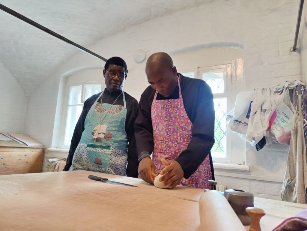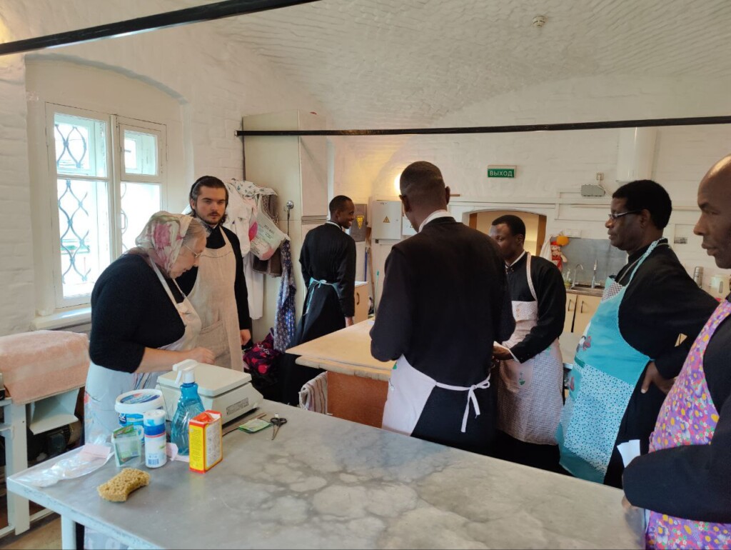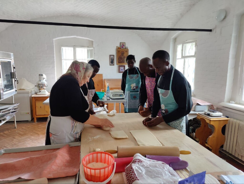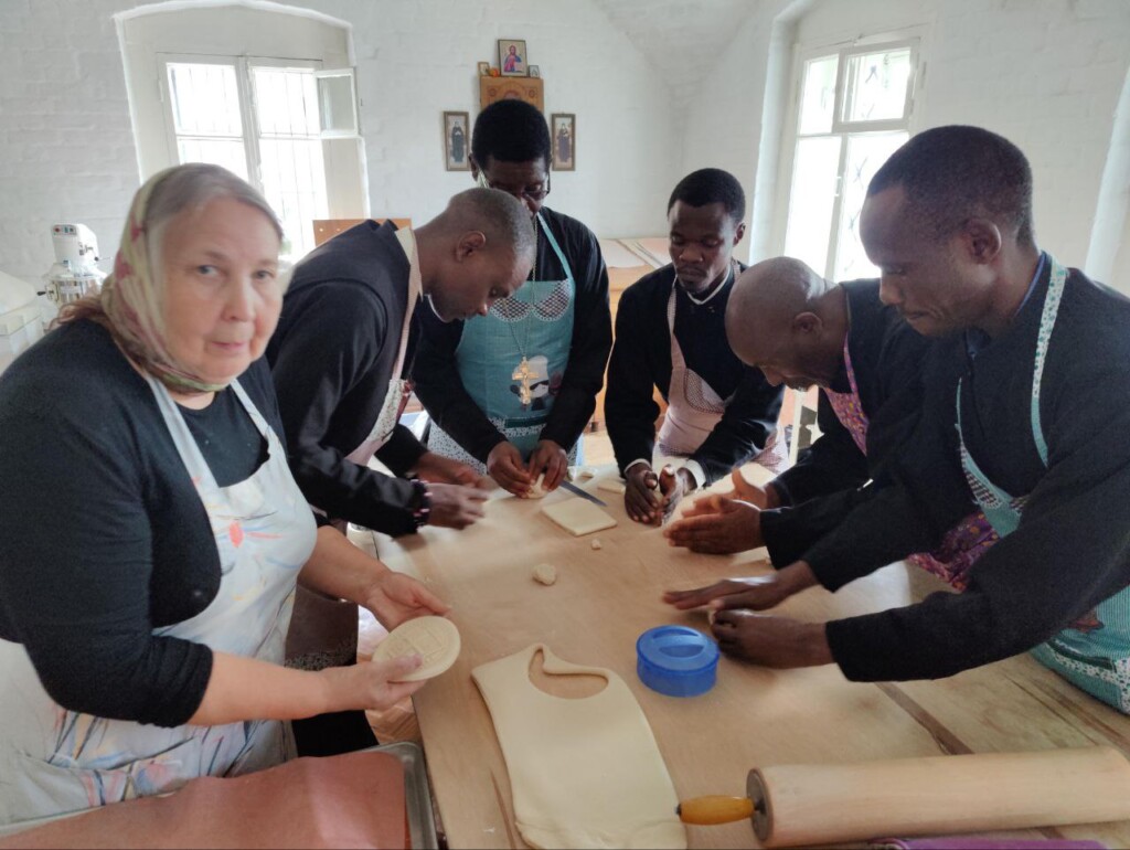 1 августа 2023 года, после Божественной Литургии, священнослужители и чтецы Патриаршего Экзархата Африки из Малави, Уганды и Кении - иерей Иоаким Бакали, диаконы Роберт Одеке и Афанасий Оком, чтецы Френсис Гатума и Георгий Окелло, проходящие в монастыре богослужебную практику, учились изготавливать и выпекать просфоры в монастырской просфорне. Наших гостей сопровождали студенты СПбДА чтецы Илья Брусиловский и Иоанн Леликов.