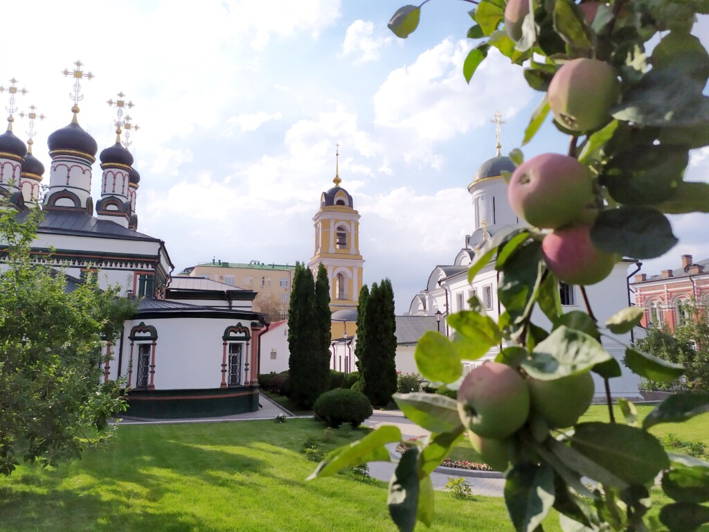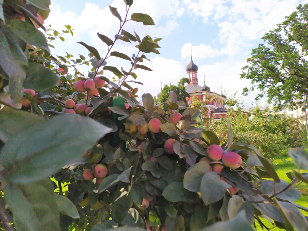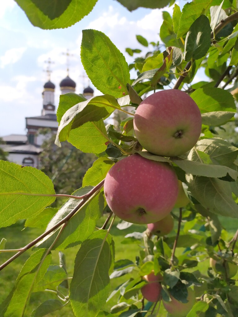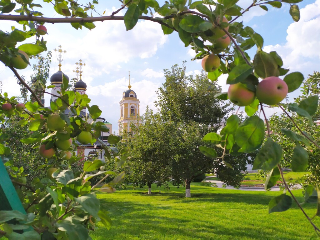 ...Монастырь встречает праздник Преображения. В этот солнечный день не только богослужение, но и природа по-своему прославляет Преобразившегося Господа. Виды обители пронизаны солнечным светом. Монастырский сад, сквозь ветви которого видны величественные храмы, ожидает благословения и освящения плодов. А над обителью простирается бескрайний небосвод...