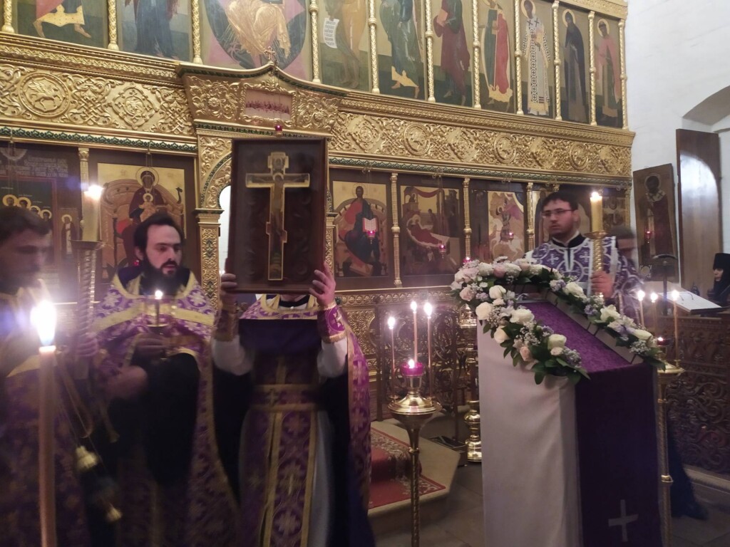 В завершение Великого Славословия для поклонения был вынесен Крест Господень, после чего, во время песнопения "Кресту Твоему покланяемся, Владыко" и определенных богослужебным уставом особых стихир, совершалось поклонение Крестному Древу. Стихиры на поклонение не только раскрывают значение Креста и спасительных страданий Христовых, не только напоминают о пророчествах о Кресте - они как бы поставляют нас перед Распятием Господа, и каждый, в свою меру, переживает это священное событие.