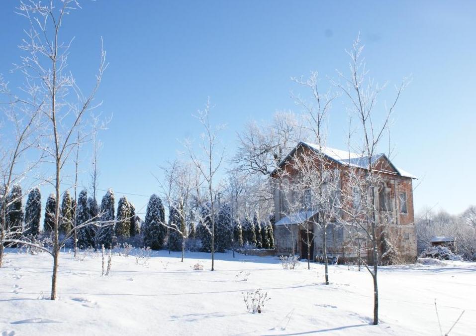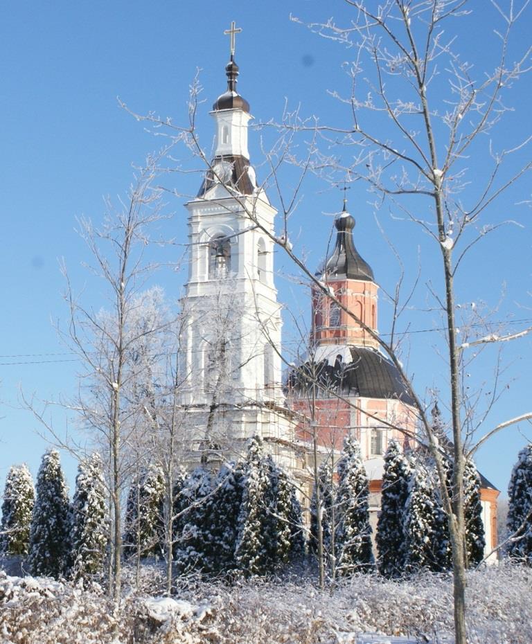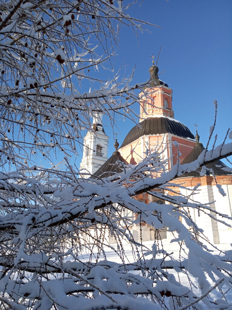 В ясные Рождественские дни на подворье обители солнечно и морозно. За рекой возвышается храм с белой колокольней, а вокруг - красивый зимний пейзаж. Все творение радуется Рождению Господа.