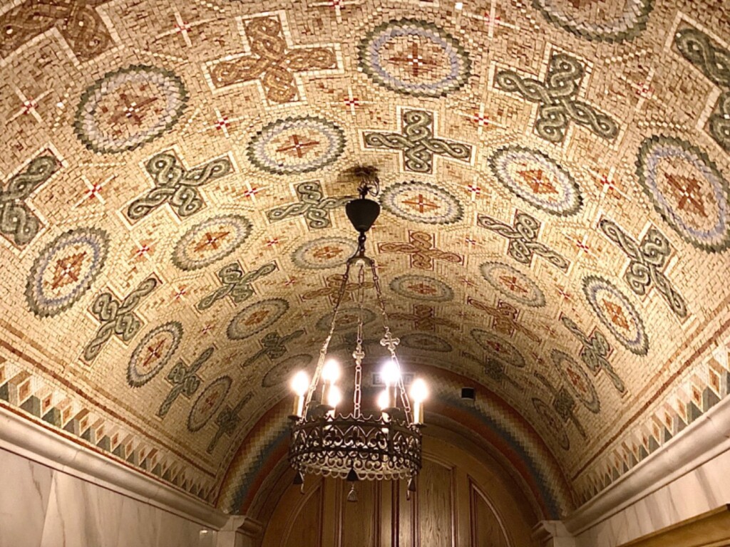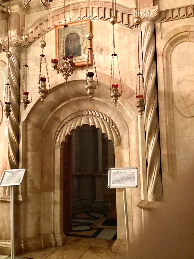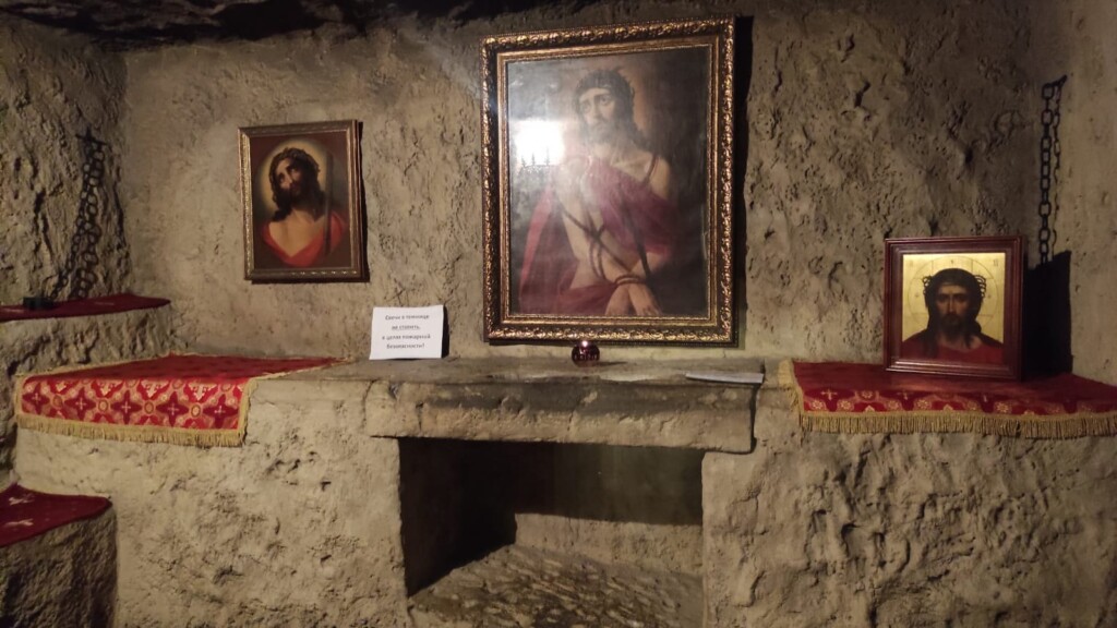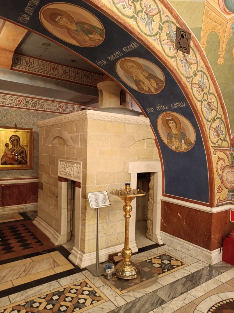Во-вторых, особое впечатление оставил нижний храм, убранство которого копирует основные священные места в Святой Земле: пещеру Рождества Христова в Вифлееме, Голгофу (место распятия Спасителя), камера заточения Иисуса Христа, камень помазания и кувуклия Воскресения Христова (место, где Спаситель воскрес), Гефсиманский гроб Пресвятой Богородицы.