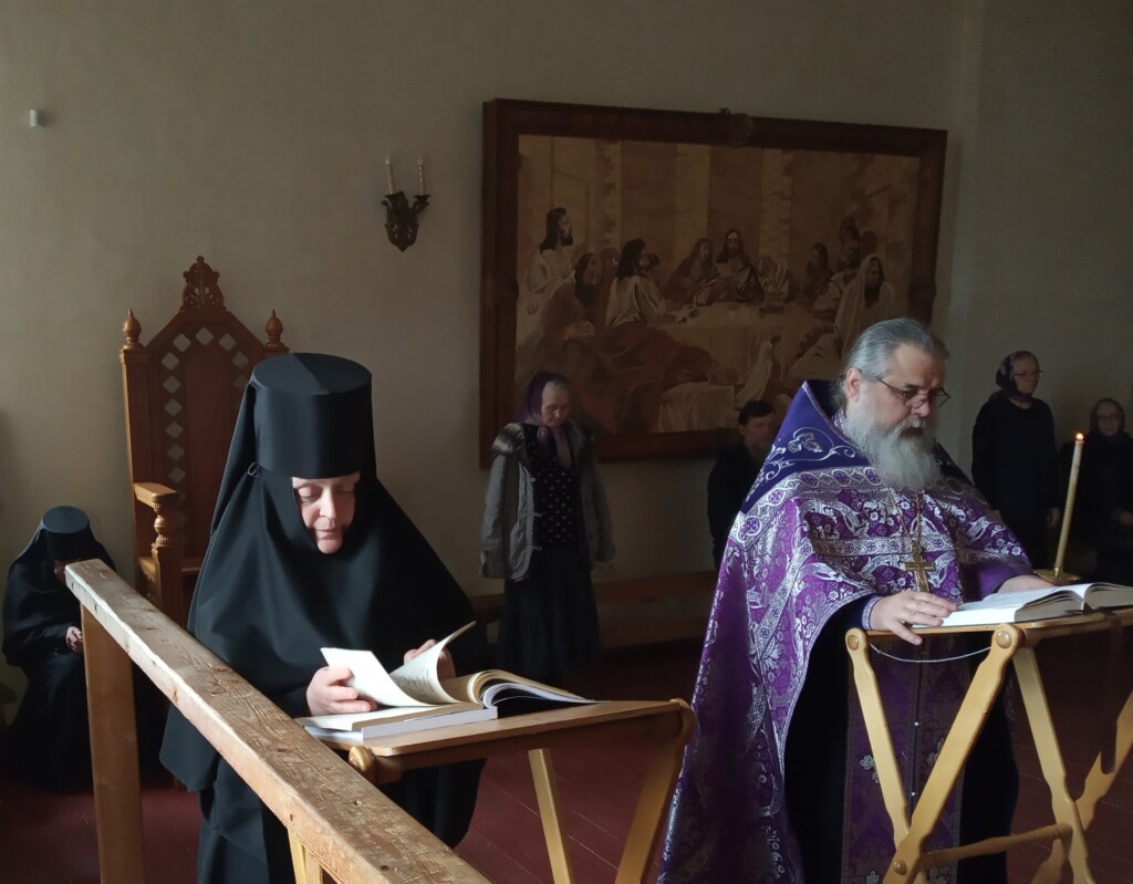 Вечером 17 апреля 2024 года, в канун четверга Великого канона, на подворье нашей обители совершено чтение Великого Покаянного канона прп. Андрея Критского полностью. Это богослужение именуется также стоянием преподобной Марии Египетской (Мариино стояние). Богослужение совершил священнослужитель монастыря протоиерей Серафим Хайруллин. В храме молились трудящиеся на подворье сестры и наши прихожане.