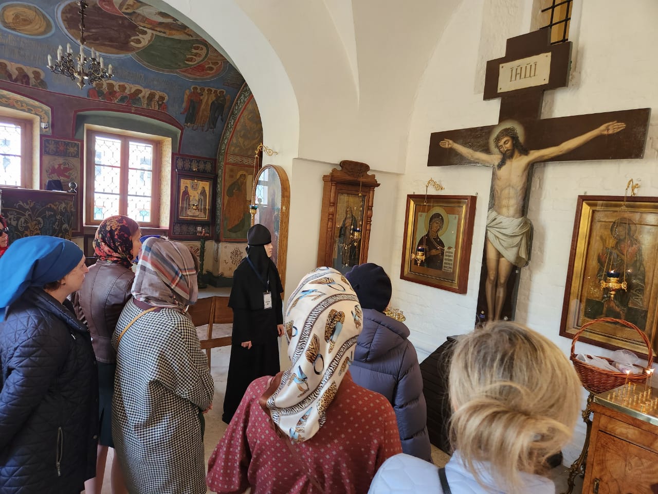 Гостей обители встретила благочинная монастыря, которая провела для них экскурсию и рассказала о монастырских святынях. Пребывание в святом месте, соприкосновение со святынями монастыря сделали экскурсию настоящим паломничеством, став не только погружением в историческое прошлое, но и возможностью проникнуться духом Христовым в преддверии Страстной седмицы и ее великих и спасительных событий.