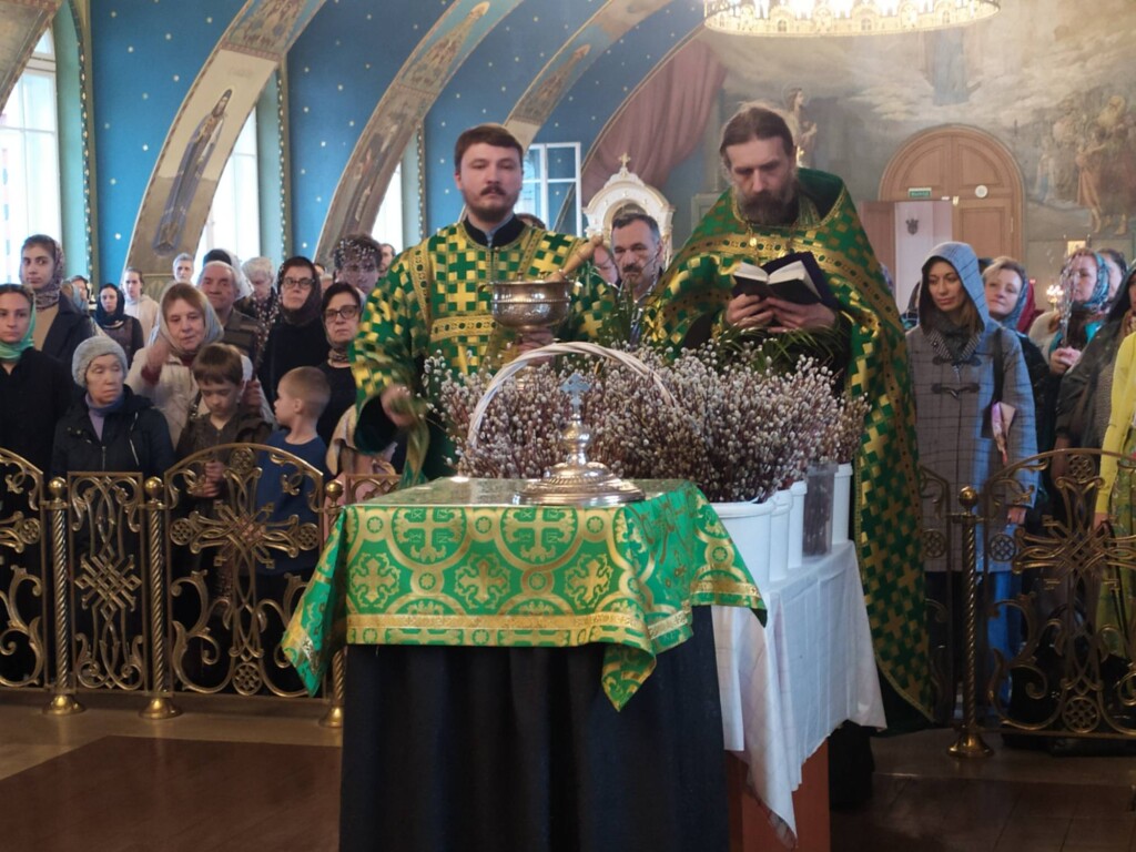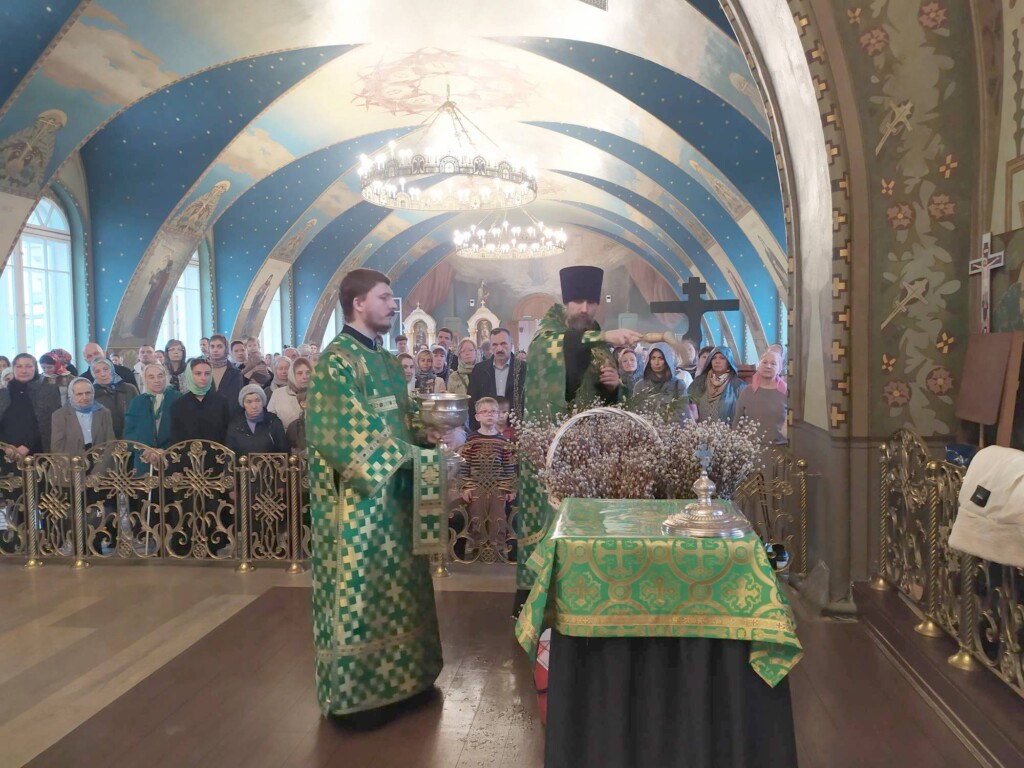 На утрени, после прочтения пятидесятого псалма, было совершено традиционное освящение верб, с которыми пришли верующие, чтобы встретить входящего во Святый Град Спасителя.