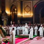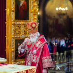 По традиции после пения пасхального канона в алтаре Святейший Патриарх Кирилл, архиереи и духовенство сменили белые облачения на красные.