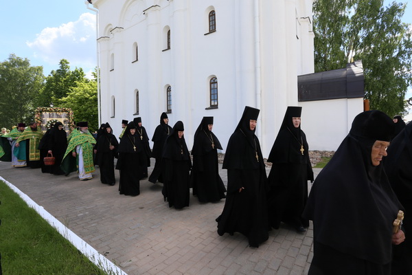 Когда мы подошли к монастырю,... то увидели, что по старинному белорусскому обычаю дорожку к церкви Спаса выстлали льняной тканью, а навстречу нам шли монахини Евпраксия и Леонила. Их поддерживали под руки, а они со слезами голосили: — «Домой возвращаешься наша мать игумения. Благодарствуем Тебе, Господи Иисусе Христе, что позволил нам дожить до этой радости».