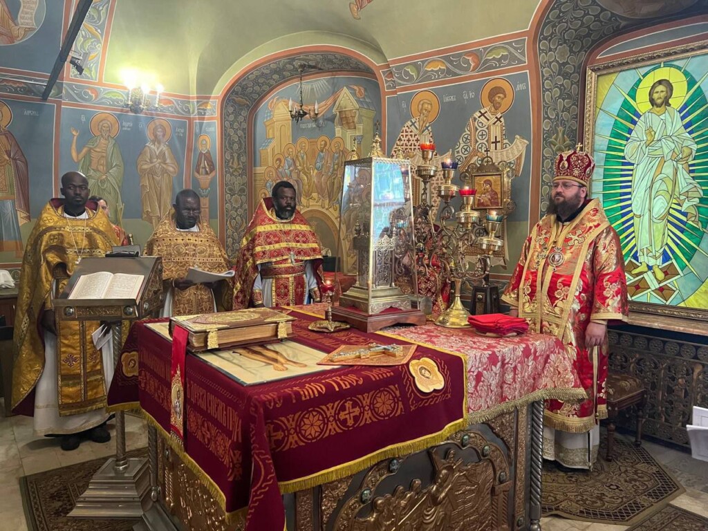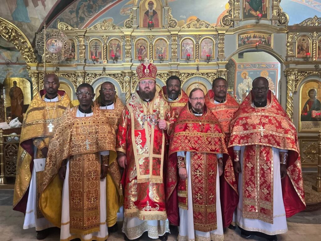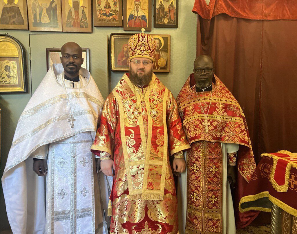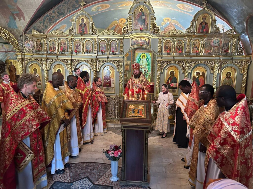 Его Высокопреосвященству сослужили клирики храма, председатель Миссионерского отдела Патриаршего экзархата Африки иерей Георгий Максимов и 6 новорукоположенных африканских священников.