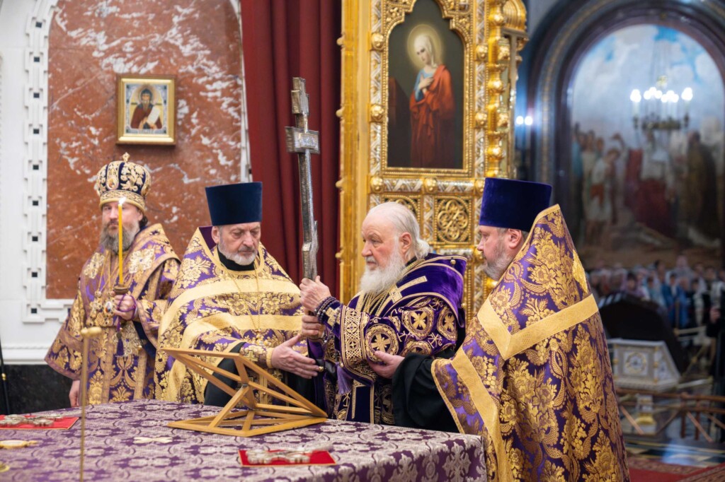 После великого славословия Предстоятель Русской Православной Церкви совершил чин Воздвижения Креста.