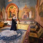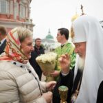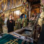 Далее Святейший Патриарх Кирилл проследовал в Троицкий собор, где совершил славление перед мощами преподобного Сергия Радонежского.