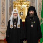 Епископ Сергиево-Посадский и Дмитровский Кирилл приветствовал Святейшего Владыку и преподнес Его Святейшеству памятную панагию.
