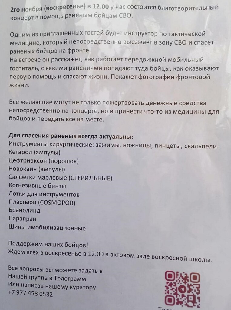 2 ноября в 12.00 в здании воскресной школы монастыря состоится благотворительный концерт в помощь раненым бойцам СВО Окт 31, 2025 | Новости обители, Помощь участникам боевых действий | Поделиться:TwitterВКонтактеОдноклассникиGoogle