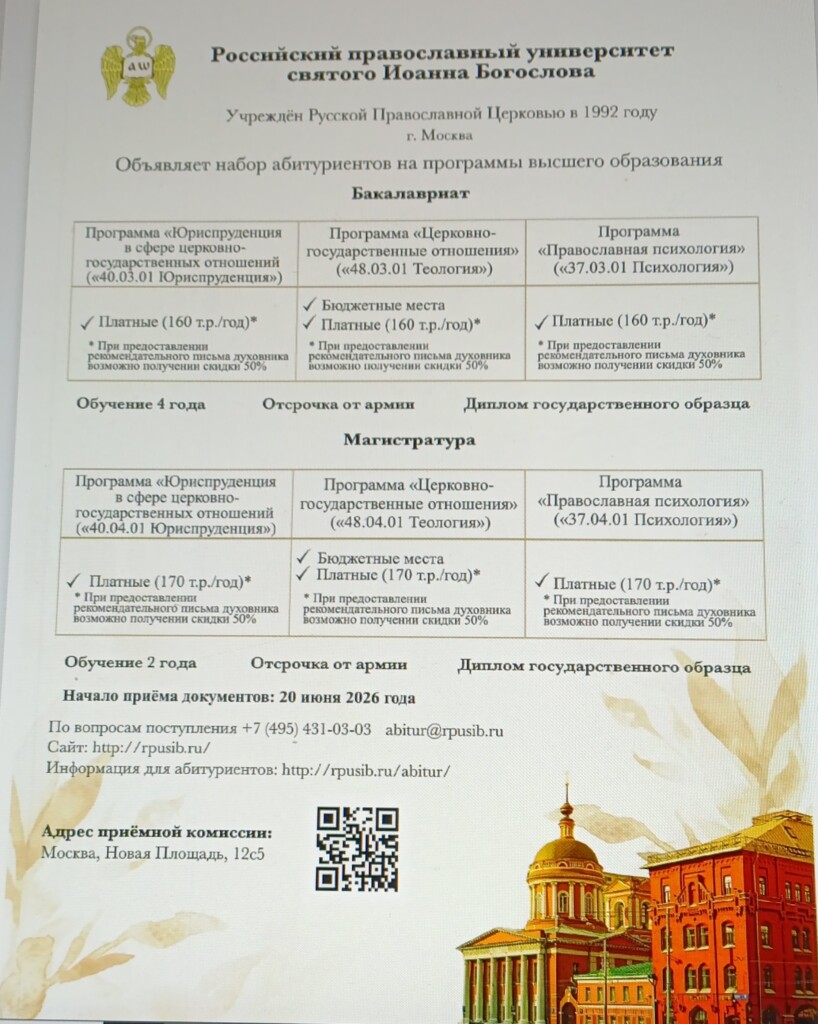 По благословению Святейшего Патриарха Московского и вся Руси КИРИЛЛА, Российский православный университет святого Иоанна Богослова осуществляет набор абитуриентов на 2026/2027 учебный год. В нынешнем году набор проходит по следующим направлениям: