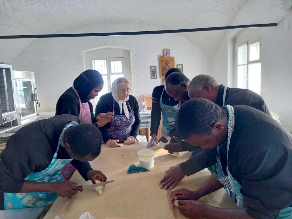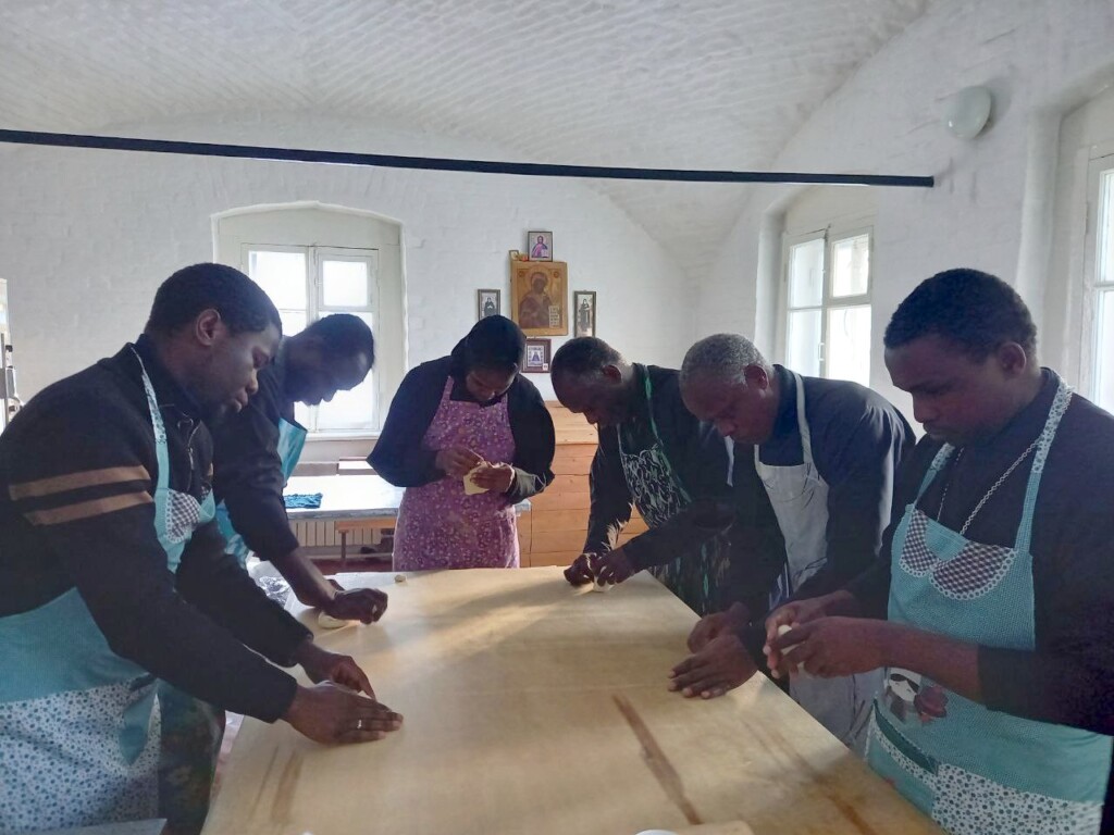 5 февраля 2026 года иерей Андрей Тушабэ (Уганда), чтецы Владимир Мдока (Малави), Давид Окурут (Уганда), Рафаил Андайи (Кения), Иаир Атиели (Кения), проходящие практику в нашем монастыре, обучались изготовлению больших служебных и маленьких просфор. Наших гостей обучали монахиня Матрона (Джепчирчир) из Кении и просфорницы обители.