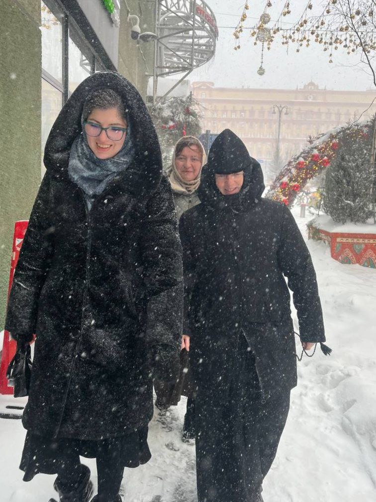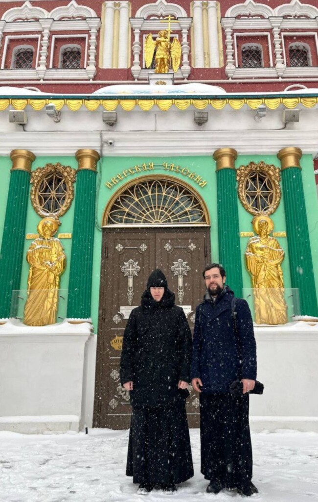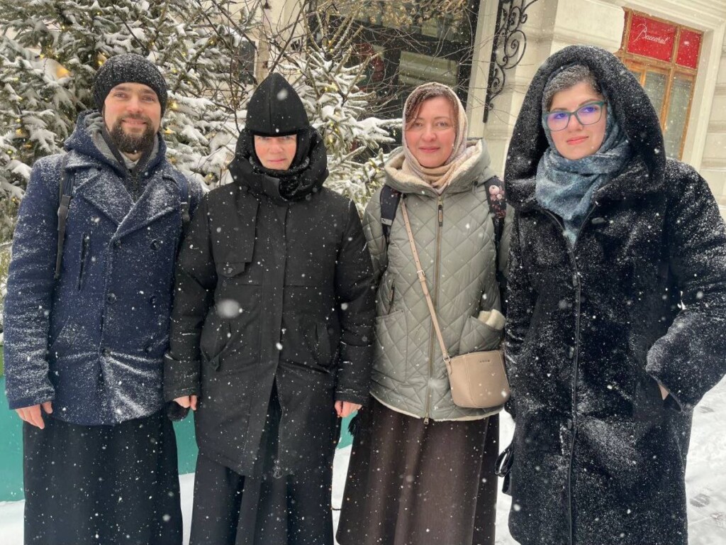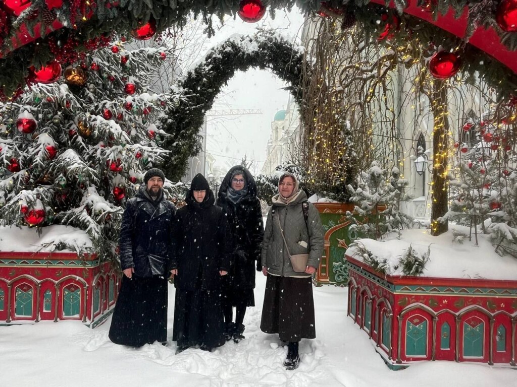 Паломнический путь от Иверской часовни, несмотря на снегопад и непростые погодные условия, открыли священник, благочинная монастыря, преподаватель юношеского исторического клуба и певчие нашей обители.